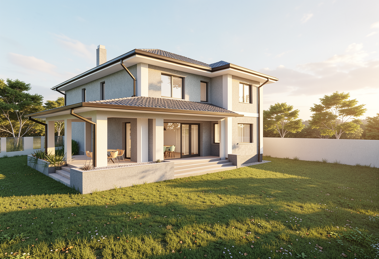 a modern industrial building with a sleek design featuring a black standing seam metal roof and walls the lower portion is adorned with light reclaimed bricks consisting of reds creams and browns adding texture and contrast the windows are tall and narrow with reflective glass panes creating a spacious feel the door is made of light natural wood providing warmth and a welcoming entrance the atmosphere is serene and minimalist set under a soft overcast sky enhancing the building s elegant simplicity