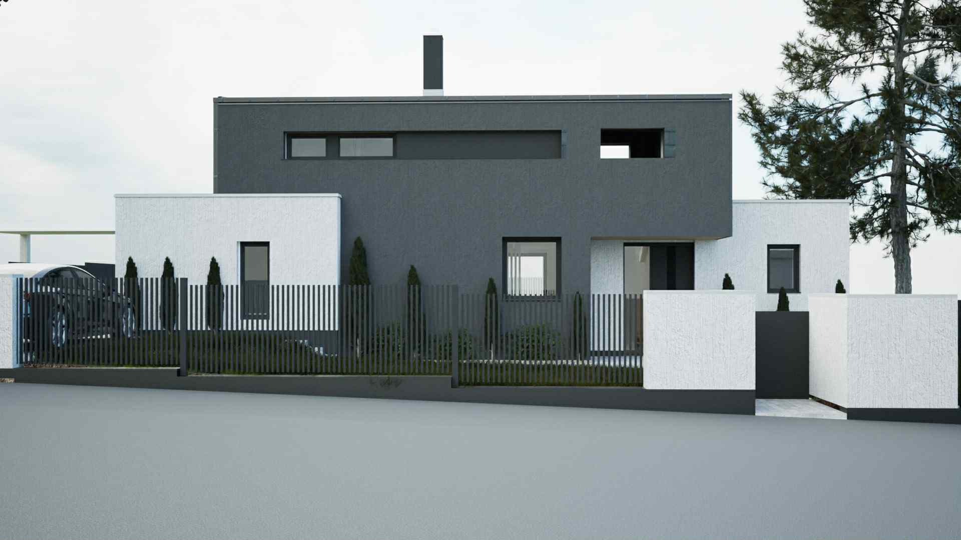 tervezzen s val s tson meg egy modern k lv rosi h zat letisztult st lusos s kort rs p t szeti diz jnnal a k ls feh r falak feh r sz n ek de nem makul tlanok ami les minimalista s eleg ns megjelen st k lcs n z az p letnek a s t tsz rke falon fekete s t tsz rke rusztikus t glaburkolat enyh n selyemf ny burkolat kifinomult kontrasztot alkotva a feh r homlokzattal a ker t s t m r elemei szint n feh rek a ker t s f m p lc s elemei antracit sz n ek selyem f nyyel az ltal nos hangulat b k s s bar ts gos l gy term szetes de h v s f ny vil g tja meg a r szben felh s enyh n dereng g alatt es ut ni hangulat n m ny helyen t cs kkal amiben t kr z dik a k rnyezet vagy a h z a h z jobb s bal oldl n legyen egy k t nagyobb fa a h z el tt 120cm s les aszfaltos j rda a j rda el tt kiss nem makul tlan helyenk nt repedezett aszfaltos ttest a h zat n v nyzet veszi k r l gondozott tereprendez ssel s b s ges n v nyzettel ami nyugalmat s term szeti sz ps get k lcs n z a kertben sz mos n v ny s z ld n v nyzet tal lhat gazdag lhet k lt ri k rnyezetet teremtve a h tt rben egy s k ny lt mez kkel t voli fasorokkal s nyugodt horizonttal amely finoman beleolvad a k lv rosi k rnyezetbe kocsifelhajt s a bek t t tiszta sz rke t rk vel van ell tva biztos tva hogy ott legyenek az ablakokban t r z dj n a t j a k pr l t vol tsad el a g pkocsit ah z tetej r l t vol tsad el ak m nyt a realizmust r szletes anyagtext r kkal kell fokozni l gy rny kok kell kei realisztikus ablakt kr z d sek k rnyezeti elmos d s s kiegyens lyozott term szetes megvil g t s ultra nagy felbont s fotorealisztikus p t szeti vizualiz ci filmes kompoz ci realisztikus anyagok modern k lv rosi letst lus a kamera n zze messzebr l a h zat