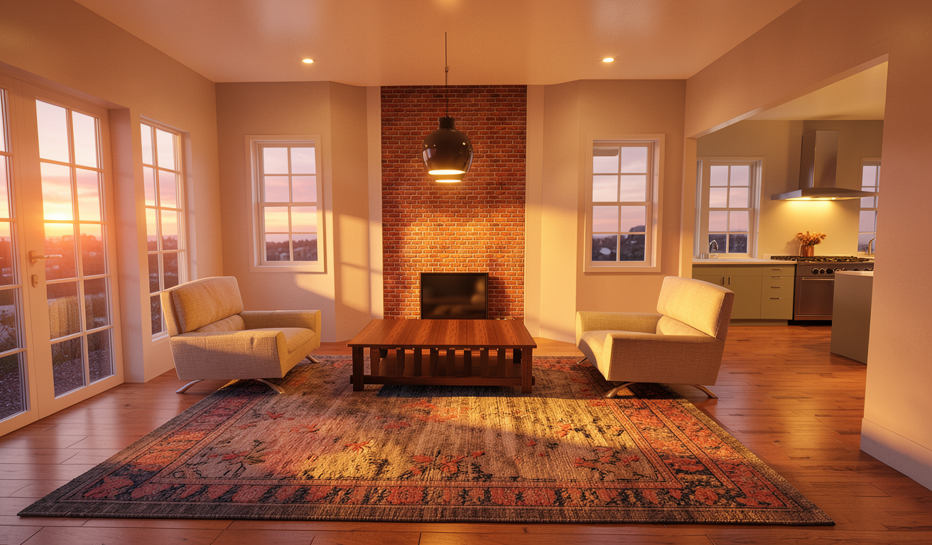 keep the exact same geometry scene content object positions materials textures and camera framing as the original render apply only atmosphere lighting mood and color grading set the scene right before golden hour sky with thin soft clouds and a cool to warm gradient steel blue overhead transitioning to warm sunset tones near the horizon use cinematic soft lighting with moderate contrast gentle shadows cool ambient fill and warm interior window glow inviting realistic wet ground with realistic reflections on asphalt paving subtle specular highlights very subtle bloom around light sources crisp but natural detail plus a very light atmospheric haze for depth color grade teal shadows cool midtones warm highlights teal in shadows and midtones warm highlights controlled saturation clean neutrals no oversaturation photorealistic architectural marketing render look balanced exposure slightly cool white balance remove the fog make it brighter