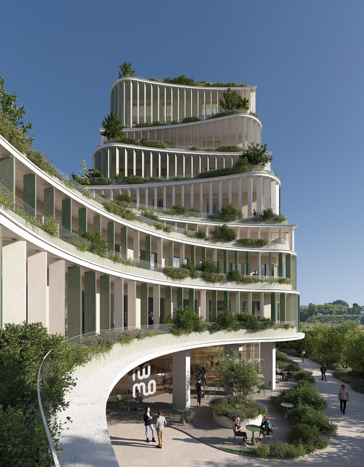 photorealistic architectural render based strictly on the provided image this is a hospital in india please include a hospital sign in the entrance on the right side of the image should be a street with an ambulance include solar powered sustainable public lightings with integrated seating and indian people