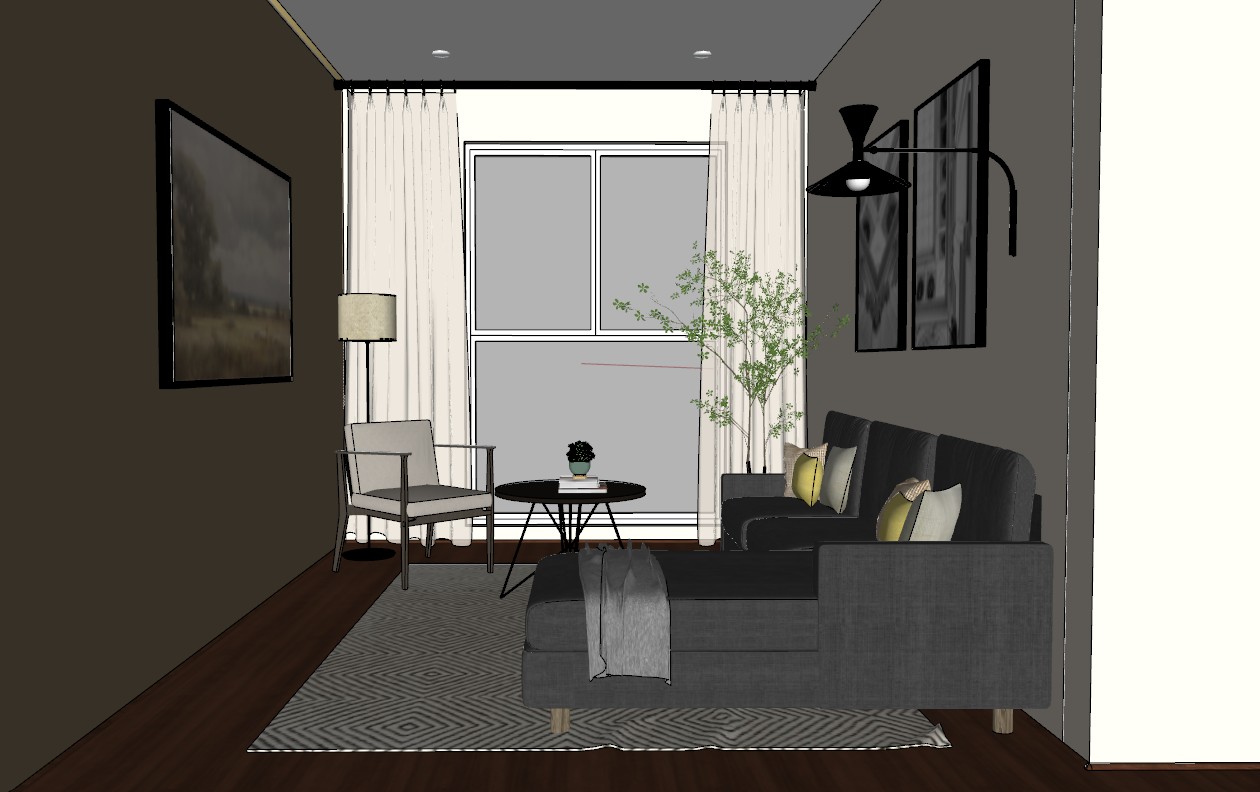 photorealistic interior render of a small contemporary living room strictly preserving the original architectural model proportions layout and furniture placement the scene features an l shaped sofa upholstered in oxford gray fabric deep slightly cool toned dark gray with visible fine textile texture decorated with neutral cushions in gray beige and subtle olive green accents a modern armchair with a thin black metal frame and light fabric upholstery is positioned adjacent to a round coffee table with a matte black metal base and dark top surface the floor is finished in dark natural wood with realistic grain patterns and a semi matte finish wall color distribution is clearly defined the left wall is a darker warm brown tone coffee like no yellow undertones with matte finish and subtle microtexture the back wall with the window is a slightly lighter brown tone maintaining warmth but with less intensity than the left wall the right side walls are lighter soft beige tones creating contrast and visual depth while keeping a cohesive warm palette a large window with white framing is centered at the back wall with slightly reflective glass and sheer white linen curtains that softly diffuse incoming daylight on the left side of the ceiling there is a recessed ceiling detail cajillo with an integrated warm led strip 3000k providing indirect ambient lighting that softly washes the darker wall and ceiling enhancing depth and realism natural lighting is soft and diffused simulating an overcast afternoon creating smooth and realistic shadows with no harsh contrasts complementary artificial lighting includes a warm floor lamp with a fabric shade and a modern black wall mounted lamp both emitting soft warm light at 3000k working together with the indirect led ceiling lighting decor elements include a tall indoor plant with thin branches and small green leaves in a light colored pot minimalist wall art in black frames with grayscale compositions and a neutral textured area rug with a subtle geometric pattern all materials use high quality pbr textures fabric with bump normal wood with detailed grain and roughness variation metal slightly reflective with realistic roughness and glass physically accurate reflections and refractions camera set at eye level approximately 1 60 m height 35mm focal length with slight depth of field focusing on the sofa and coffee table physically correct exposure and neutral white balance ultra photorealistic render global illumination enabled ray tracing accurate reflections soft ambient occlusion high quality soft shadows no overexposure no stylization no cartoon effect no exaggerated colors architectural visualization real life photography style