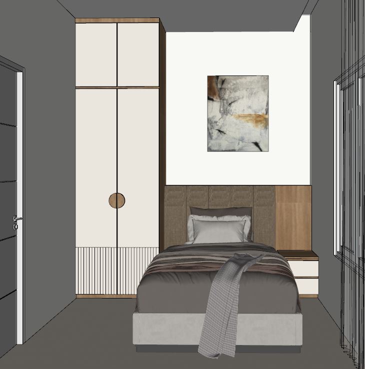 buat gambar ultra realistis tanpa mengubah struktur bentuk desain atau material apa pun jangan mengubah ukuran jpeg lantai menggunakan keramik polos glossy warna beige dinding warna off white dan plafond warna putih tambah lampu spot light di plafond dan tambah lampu indirect light ke curtain valance dan drop ceiling pintu warna abu terang dengan kusen putih dan tambah indirect light ke atas headboard dan jangan ubah material warna dan bentuk