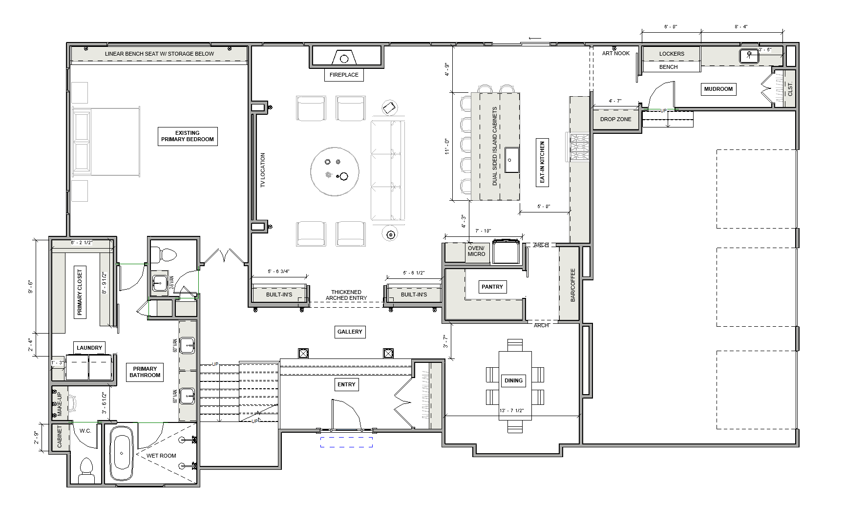 convert this floor plan into a realistic isometric 3d view of a full house show the space from an elevated angle with furniture walls and details visible make this a modern organic home with darker hardwood flooring light wood cabinets marble countertop mosaic bathroom tile accent light fixtures and wall sconces use the same furniture as shows on the plan do not change the orientation of the floorplan