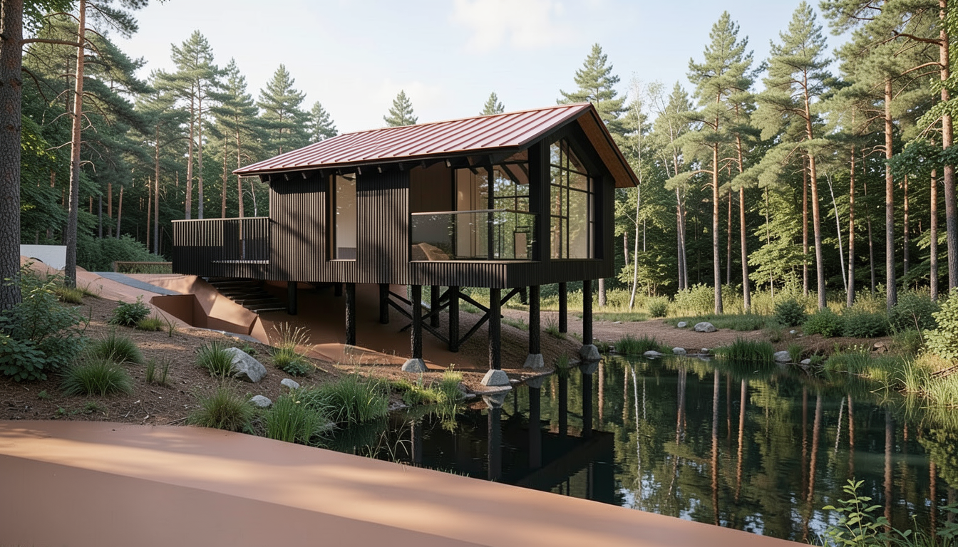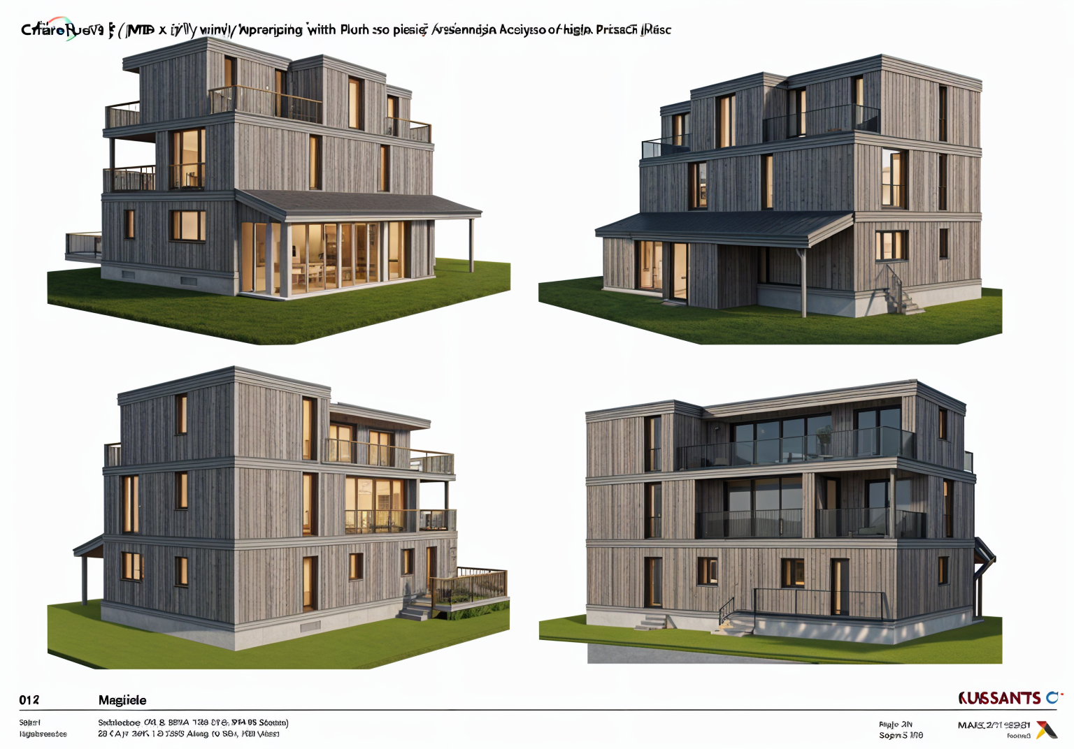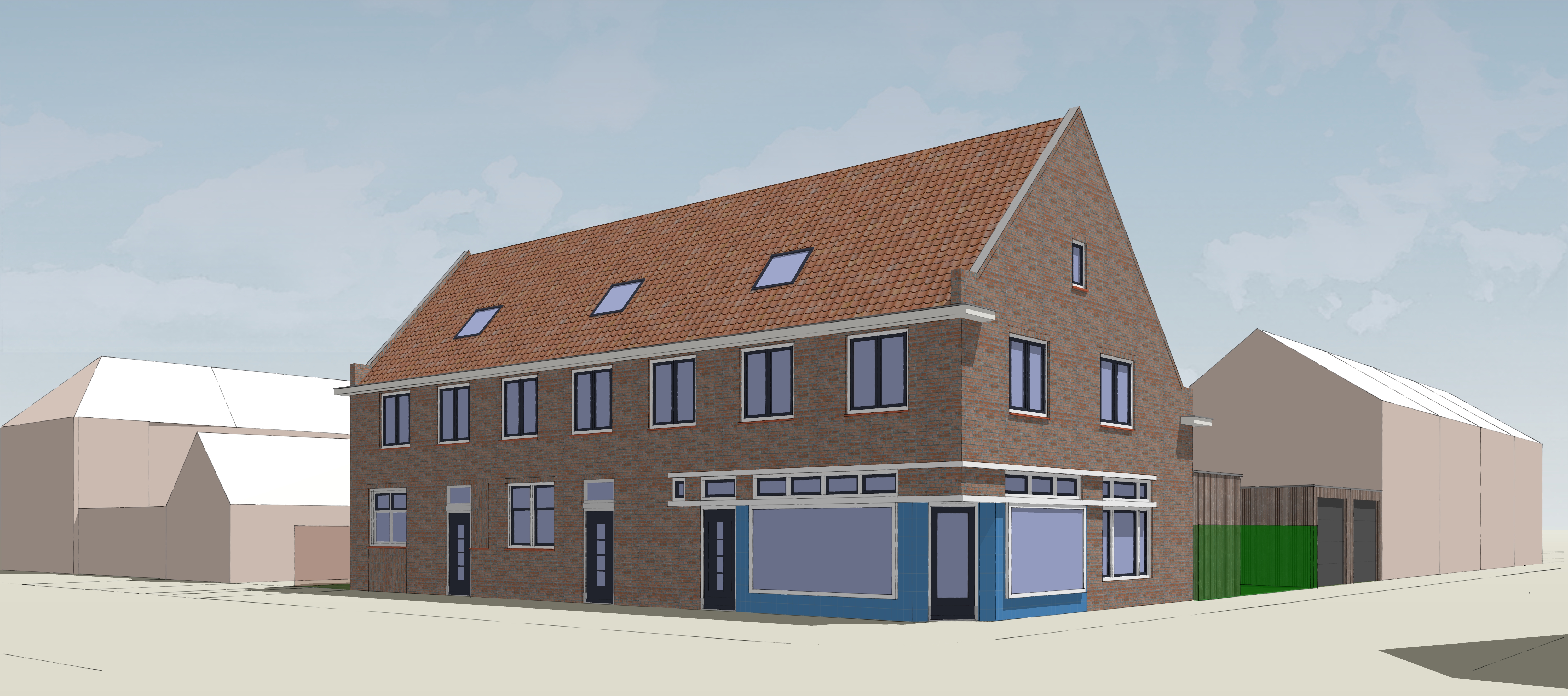 make this a photorealistic scene add some people trees and bushes the weather is sunny with a few clouds the blue part in the facade are blue tiles