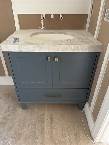 do not change the cabinets in any way preserve the exact cabinet colors materials finishes dimensions door and drawer styles hardware spacing alignment and all geometry exactly as shown do not alter the countertop shape backsplash appliances flooring lighting fixtures or wall structure only remove the construction materials clutter and mess from the scene clean the room and make it look finished and staged add a few simple tasteful home accessories appropriate for the style of the space but do not add or remove any furniture windows or architectural elements maintain the original lighting direction and realism enhance clarity and polish the photo while keeping the cabinetry and room design completely unchanged do not alter the lighting to keep the cabinet colors as they are in the image re stage for a bathroom add a faucet out the wall put in a mirror above the faucet new flooring