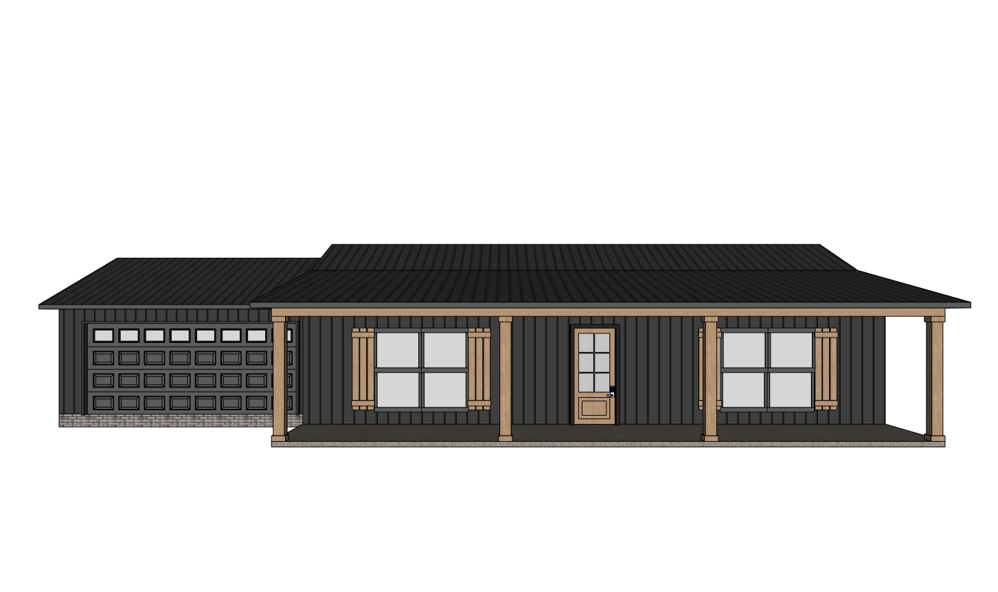 generate a beautifully rendered image of a modern house with a dark sleek exterior the house should feature charcoal gray vertical siding and a matching dark roof include a wooden porch in a warm oak color providing a natural contrast the garage door should be a dark gray to blend with the exterior set the scene during a serene twilight with ambient lighting highlighting the architecture creating a cozy and inviting atmosphere use soft warm lighting to enhance the wooden elements and provide depth to the overall composition