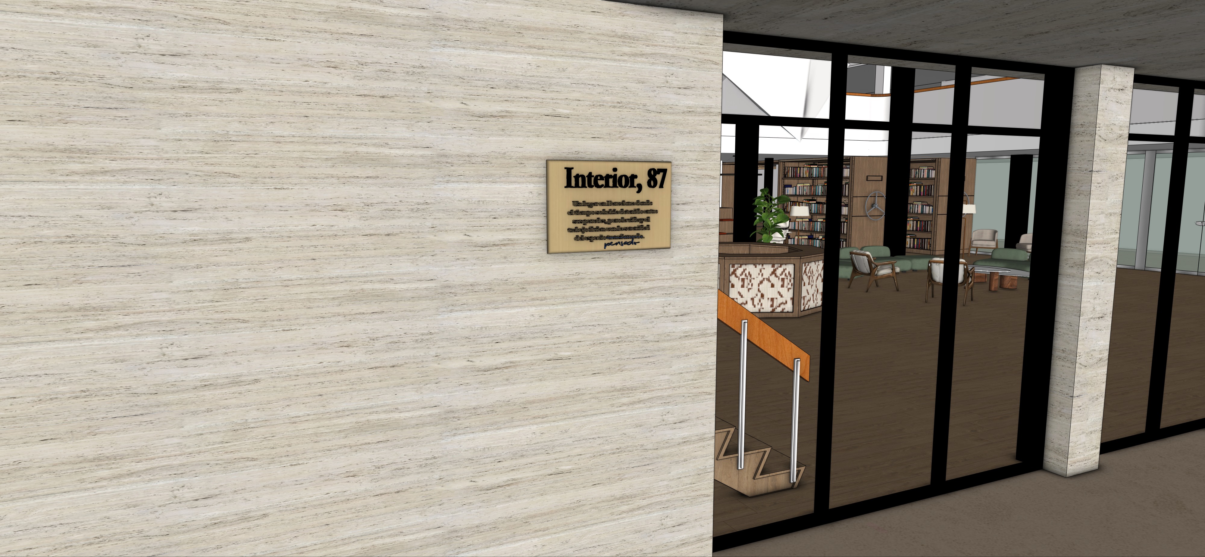 create a photorealistic architectural render based strictly on the provided sketchup image absolutely do not modify architecture proportions camera angle composition materials colors text content objects placement interior layout visible through the glass the scene must remain exactly as modeled important material preservation the wall cladding must remain light travertine stone with horizontal texture the window frames must remain matte black metal the glass must remain transparent and neutral no tint changes the plaque on the wall must remain brushed gold metal maintain brushed gold texture with subtle horizontal grain soft metallic reflection no chrome effect no color shift do not change the typography or engraving keep the exact same size placement and proportions lighting natural realistic daylight soft exterior illumination no dramatic sunset no warm color grading neutral architectural photography lighting interior visible through the glass must remain unchanged do not add furniture do not remove elements do not add people style high end architectural visualization clean realistic material accurate rendering photorealistic textures with subtle reflections no redesign no reinterpretation no added decorative elements preserve the model exactly