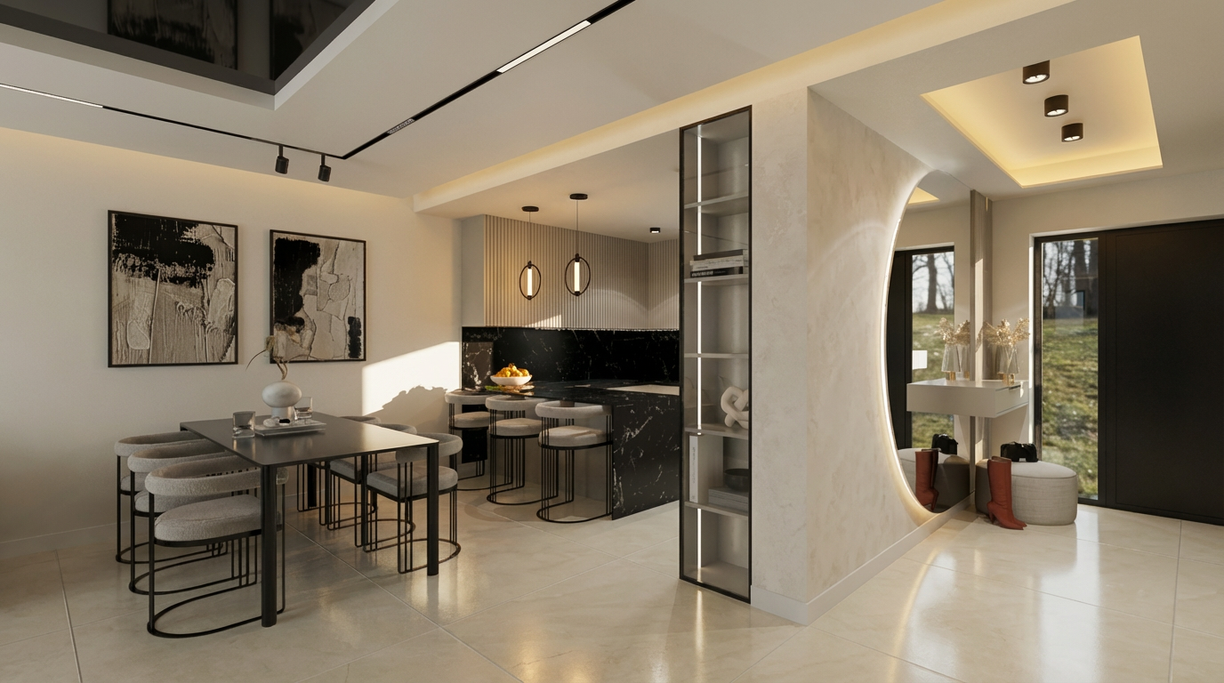 preserve the exact layout camera angle and placement of all elements do not move or redesign anything replace the wood floor with large rectangular modern tile neutral color