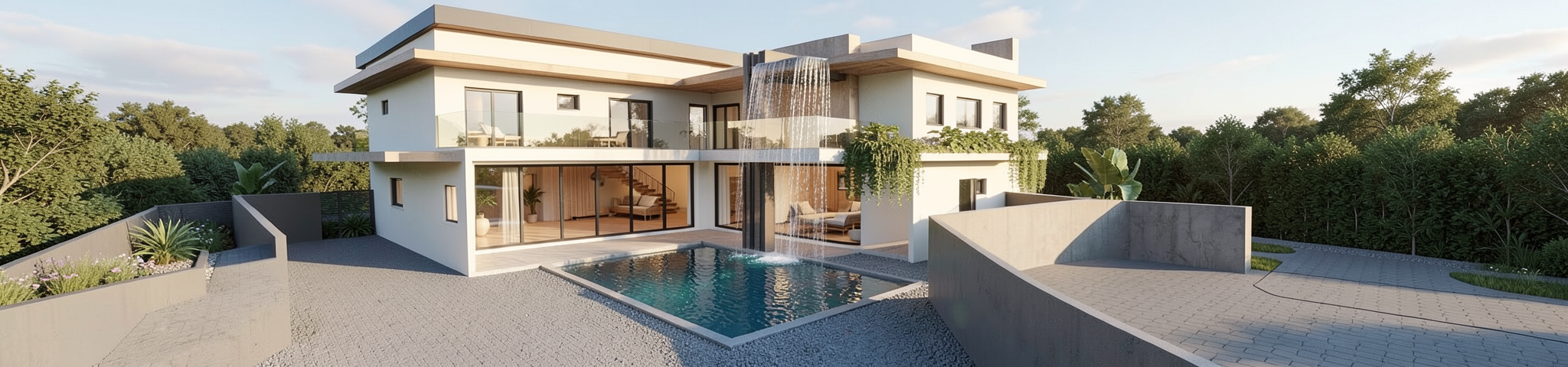 reduce waterfall making it shorter coming out from the first floor only connect pool to the open side door