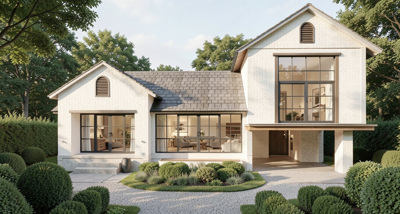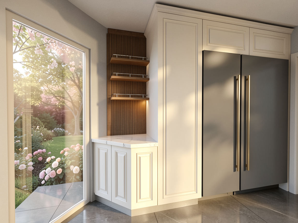 photorealistic interior render of a high end hair salon and professional studio lighting the main walls and the built in column cabinet are painted in little greene portland stone deep warm grey green the custom cabinet features shelving in pava lavasteen monza wood light textured wood the styling stations have thin countertops made of light grey beton cire microcement the foreground floor is decolegno sable ls92 transitioning in the background to a beige terrazzo floor with fine aggregates two styling chairs upholstered in verotex barbuda pro 24 fabric soft textured weave on the left a large glass partition with elegant bronze metal frames the wall behind the bronze frames is painted in little greene attic ii deep dark tone the ceiling has a light raw concrete look with a white track lighting system and white spotlights small details black minimalist wall sconces next to oval mirrors white electrical sockets and a black metal structural pipe on the far left high end finish 8k resolution architectural photography style