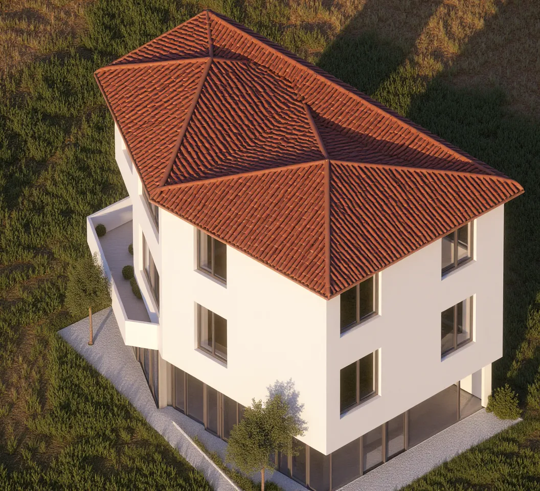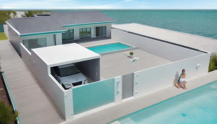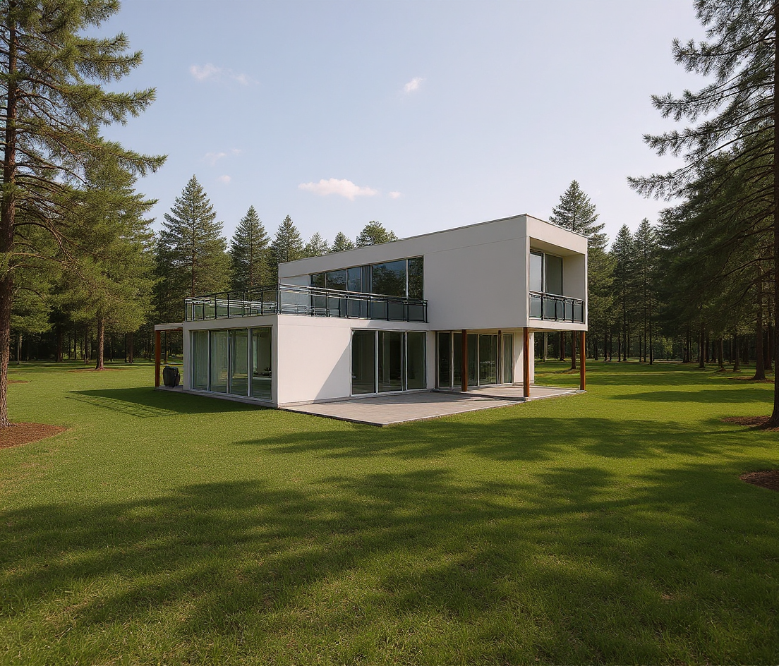 ultra modern minimalist house pure white smooth facade expansive floor to ceiling glass windows tall slender trees lining a curved stone walking path sleek concrete driveway with a luxury electric car parked quiet upscale residential neighborhood golden hour sunlight soft shadows photorealistic clean sharp geometry