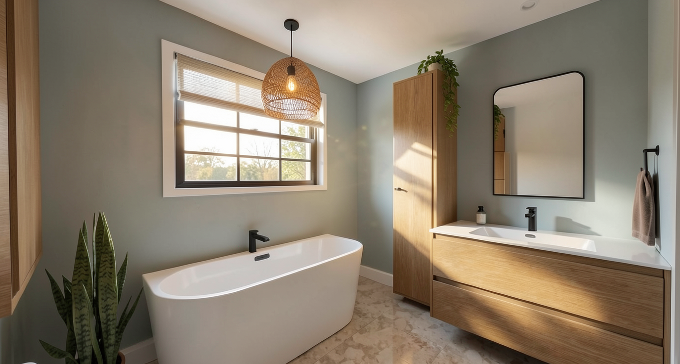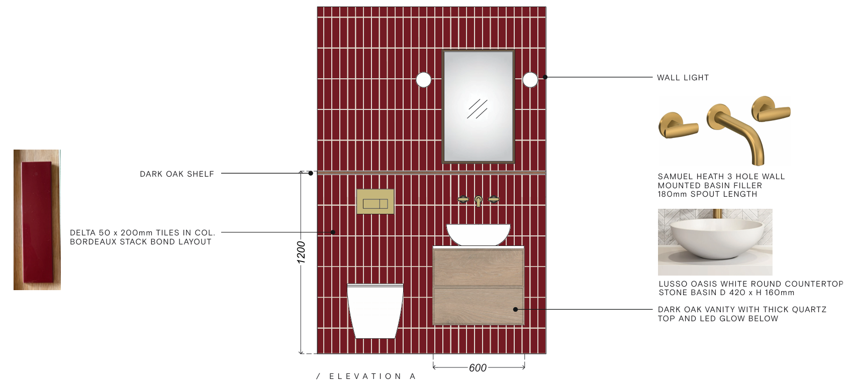 transform this 2d bathroom elevation drawing into a photorealistic 3d interior render maintain exact layout proportions and positioning of all elements materials and finishes walls covered in vertical stack bond tiles 50x200mm in deep glossy bordeaux red with visible reflections and subtle grout lines floating vanity in dark oak wood with realistic grain texture and matte finish thick white quartz countertop with smooth matte surface white round stone vessel basin with smooth matte finish brushed brass wall mounted 3 hole faucet with realistic metallic reflections matching brushed brass flush plate slim dark oak shelf running horizontally across the wall lighting soft ambient warm lighting 3000k two wall lights beside mirror emitting diffused glow subtle led underglow beneath floating vanity creating soft shadow and floor illumination realistic light bounce and reflections on glossy tiles mirror frameless rectangular mirror with slight reflection and soft glare scene realism add depth shadows and realistic spatial perspective maintain clean modern luxury bathroom aesthetic camera positioned front facing slightly elevated eye level high detail photorealistic rendering soft shadows global illumination avoid changing layout or proportions over stylization or unrealistic materials adding extra objects or clutter