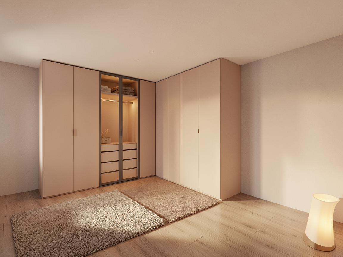 armadio con ante bianche e mensole in legno dentro l armadio metti dei vestiti da donna sui toni del rosa e la mensola sopra al cassetto in vetro e fa vedere il contenuto del cassetto sotto sotto alla mensola in vetro ci sono dei cassetti larghi come l armadio sul soffitto ci sono tre faretti bianchi accesi luce calda