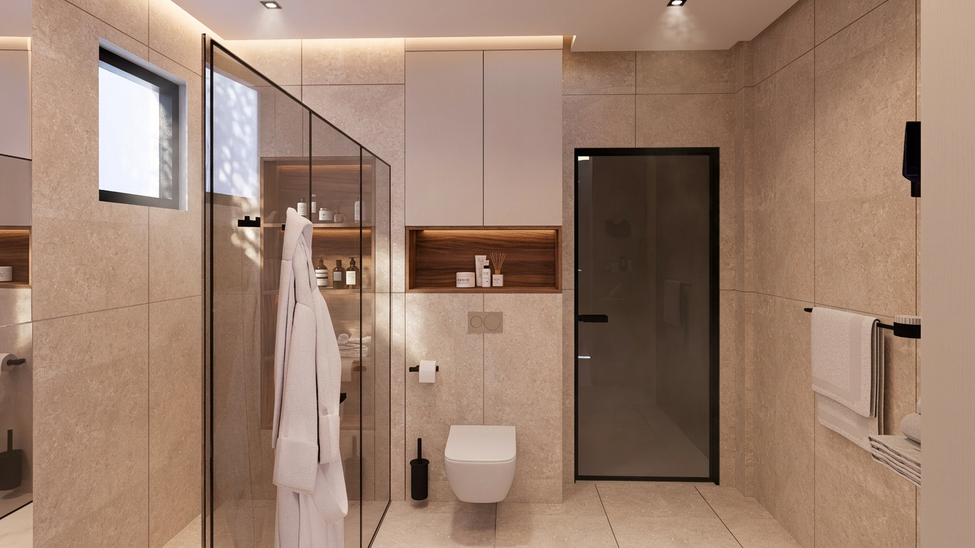 convert this architectural rendering into a highly realistic editorial style architectural photograph maintain the exact architecture geometry layout proportions materials and design details exactly as modeled do not redesign restyle add remove or reinterpret any elements do not introduce new furniture materials fixtures or architectural features this is the same bedroom shown from a different camera angle only the viewpoint changes the goal is to increase realism only making the image appear as if it were captured by a professional architectural photographer for a luxury real estate editorial listing enhance realism through soft natural daylight entering through the windows balanced exposure typical of luxury real estate photography accurate material textures and natural scale subtle shadow depth and natural light bounce refined highlights and soft reflections crisp lens clarity with natural perspective materials already present in the space include wide plank basketweave wood flooring walls painted sherwin williams origami white wood ceiling beams scalloped origami white plaster ceiling between the beams material realism should include wood flooring showing authentic grain natural tonal variation and subtle matte finish plaster ceiling surfaces appearing soft and sculptural with gentle shadowing that reveals the scalloped detail wood beams showing natural wood texture and realistic depth the exterior doors and windows have black frames exactly as shown in the rendering and must remain unchanged through the windows the view overlooks the backyard with lush estate style landscaping appearing natural refined and consistent with a high end residential property all materials should appear soft and natural with smooth tonal transitions no harsh lines and no exaggerated contrast lighting should feel like soft natural daylight creating subtle highlights and smooth shadow gradients across surfaces the final image should read as a luxury editorial architectural photograph calm refined highly realistic and professionally photographed short realism add on enhance realism only do not change architecture geometry layout materials colors window frames or design elements produce a highly realistic editorial architectural photograph with natural daylight balanced exposure accurate textures and soft shadow transitions