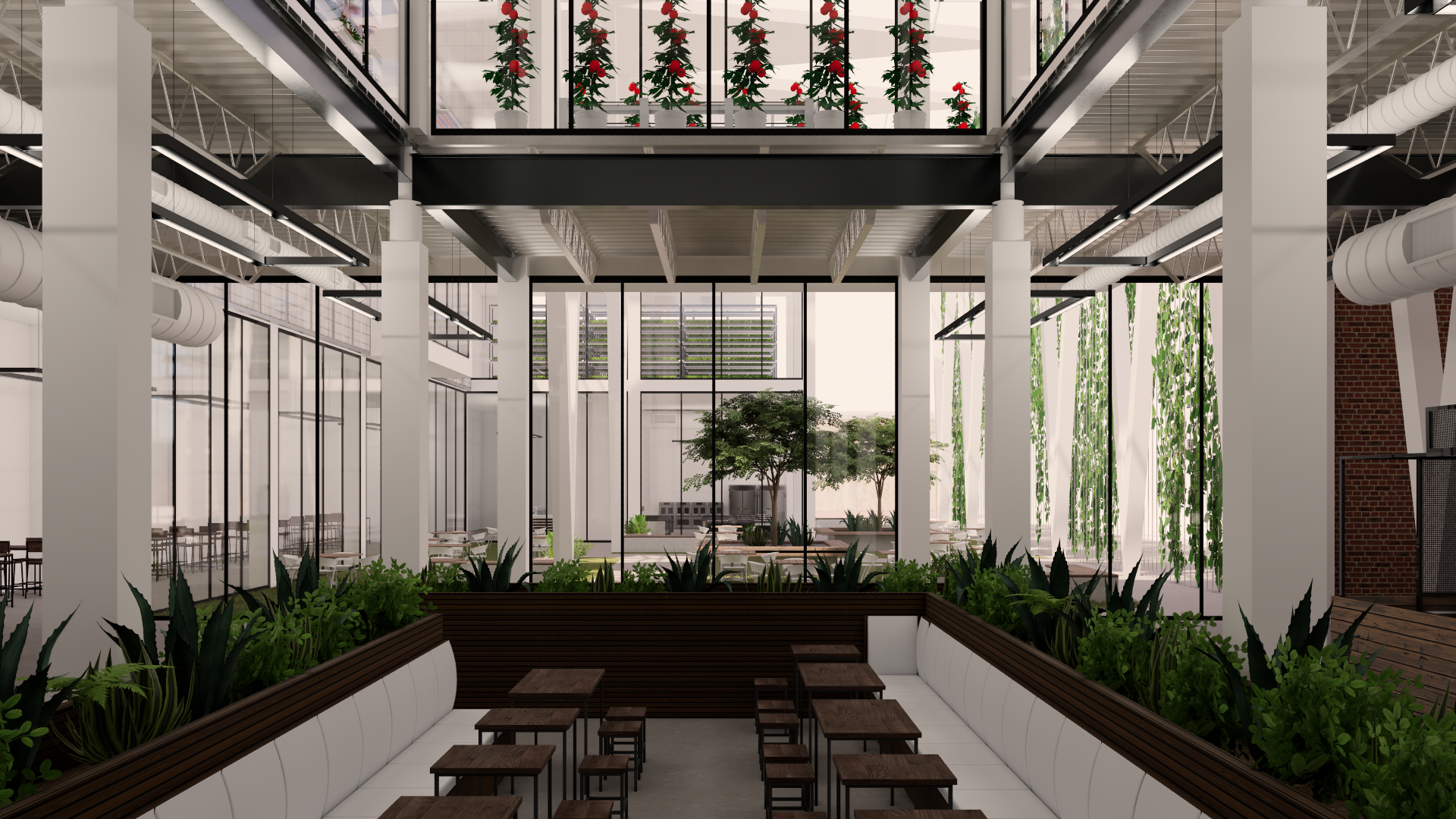 do not change any architecture geometry layout camera angle furniture vegetation placement or structure maintain the exact scene refine only materials lighting and realism lighting bright neutral daylight no yellow or dingy tones clean global illumination with soft shadows preserve the hanging linear rectangle lights with a soft diffused internal glow not bright not glossy no haze or cinematic fog materials concrete columns walls light warm gray with subtle micro texture steel i beams trusses joists and roof deck matte industrial metal with low reflectance absolutely no shininess no gloss no chrome soft diffuse shading only planter box wood walnut with realistic 4 6 plank proportions and correctly scaled grain bench cushions clean warm taupe upholstery with soft highlights and mild texture tables chairs matte wood grain crisp edges floor polished concrete with subtle reflections and realistic micro texture glass curtain walls clean crisp reflections higher clarity vegetation keep all plant placement exactly the same slightly increase clarity and natural vibrancy no neon tomato plants on the mezzanine above make them realistic with believable leaf shapes natural vine structure correct fruit size and subtle variation avoid plastic looking leaves or repeating patterns overall look bright clean fresh architectural visualization improve realism only do not modify geometry or add new objects absolutely no added people