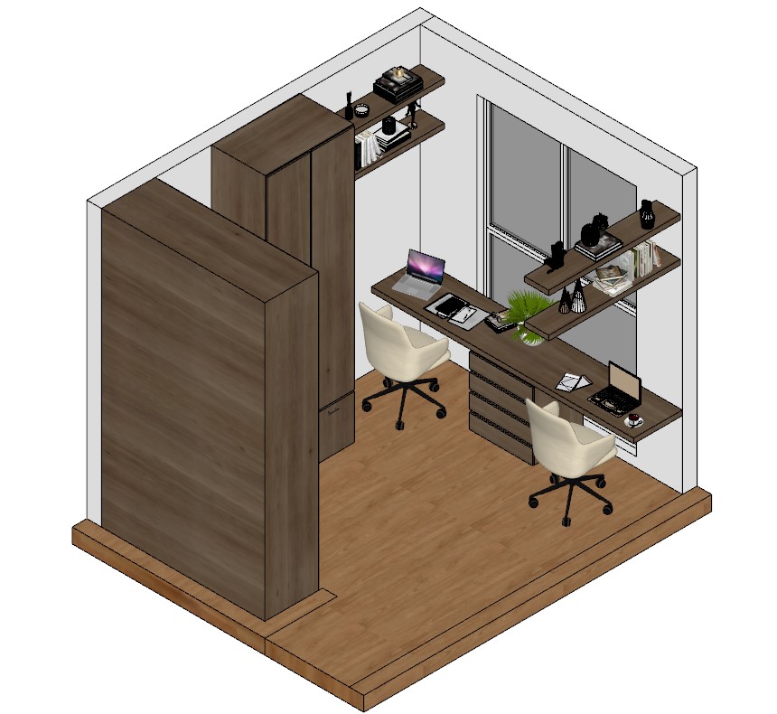 contemporary home office interior true to life architectural model proportions compact space with a linear desk made of medium toned natural wood with visible grain and a matte finish designed for two workstations two ergonomic chairs upholstered in light beige fabric with black legs integrated drawers under the desk side wall with a closet and a vertical cabinet made of wood in the same finish as the desk with realistic texture and natural grain variation floating wooden shelves above the desk with decorative objects books matte black vases minimalist pieces and organized office accessories side window with white framing and slightly reflective glass allowing soft natural light to enter a green decorative plant on the desk providing organic contrast warm dark toned natural wood floor with realistic grain and a semi matte finish smooth white walls with matte paint predominant natural lighting time cloudy morning creating soft diffused shadows subtle warm ambient artificial lighting 3000k without overexposure high quality pbr textures for wood fabric metal and glass realistic details on laptops notebooks and desk objects camera view slightly elevated axonometric style with smoothed edges not fully isometric with perspective correction for greater realism approximate height of 1 60 m lens 28 35mm photorealistic render global illumination enabled ray tracing physically accurate reflections and refractions subtle ambient occlusion soft shadows no excessive saturation no cartoon effect