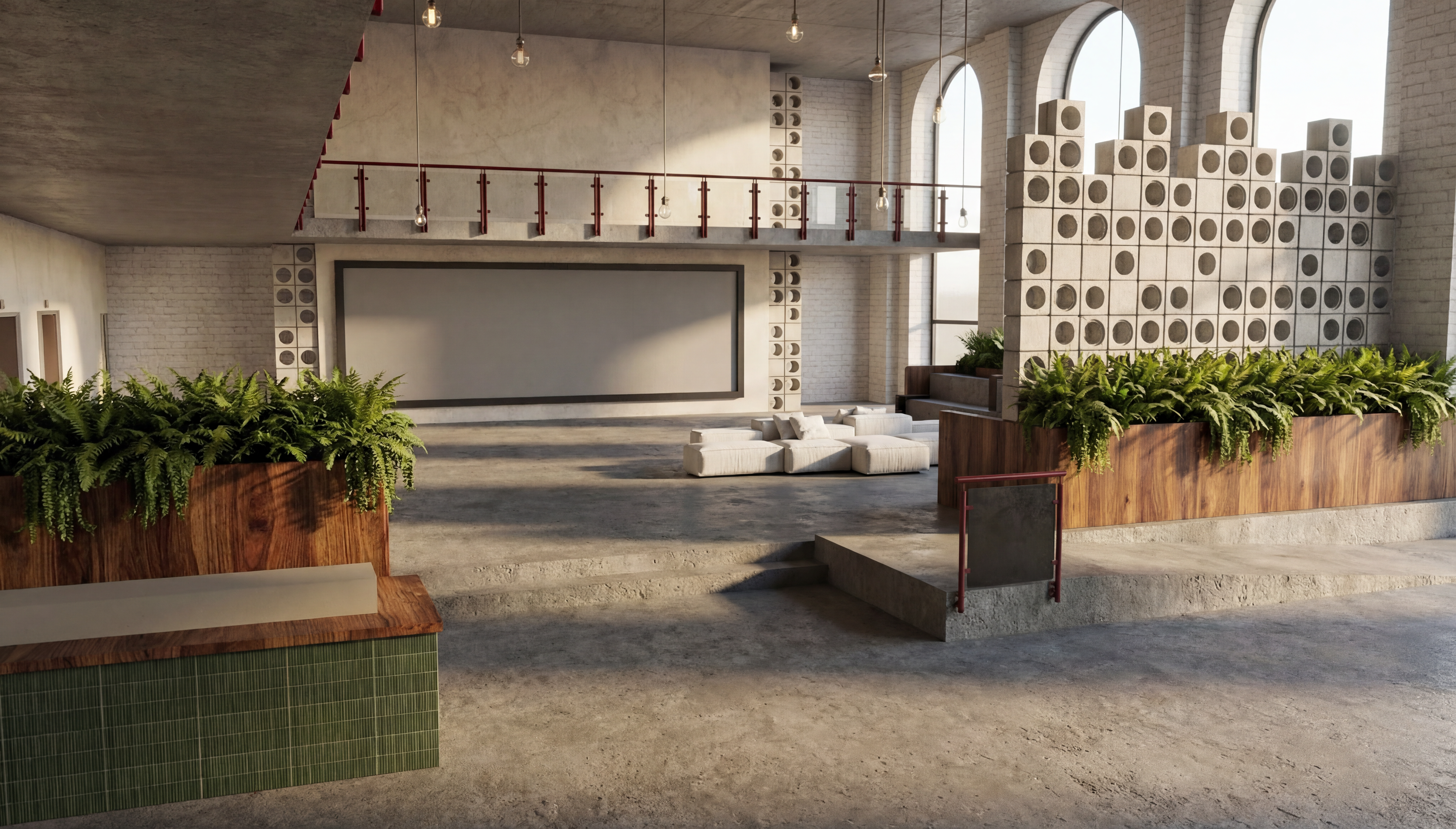 make this image more realistic add a velvet effect to the fabric of the sectional add a cream boucle fabric to the curved white sofa in the front of the image turn on all interior lighting and make them produce a warm glow add undercabinet and undercounter lighting in the kitchen place accent pillows on the sectional and color them navy grey cream and sage green keep the sectional color the same don t change anything else about the image