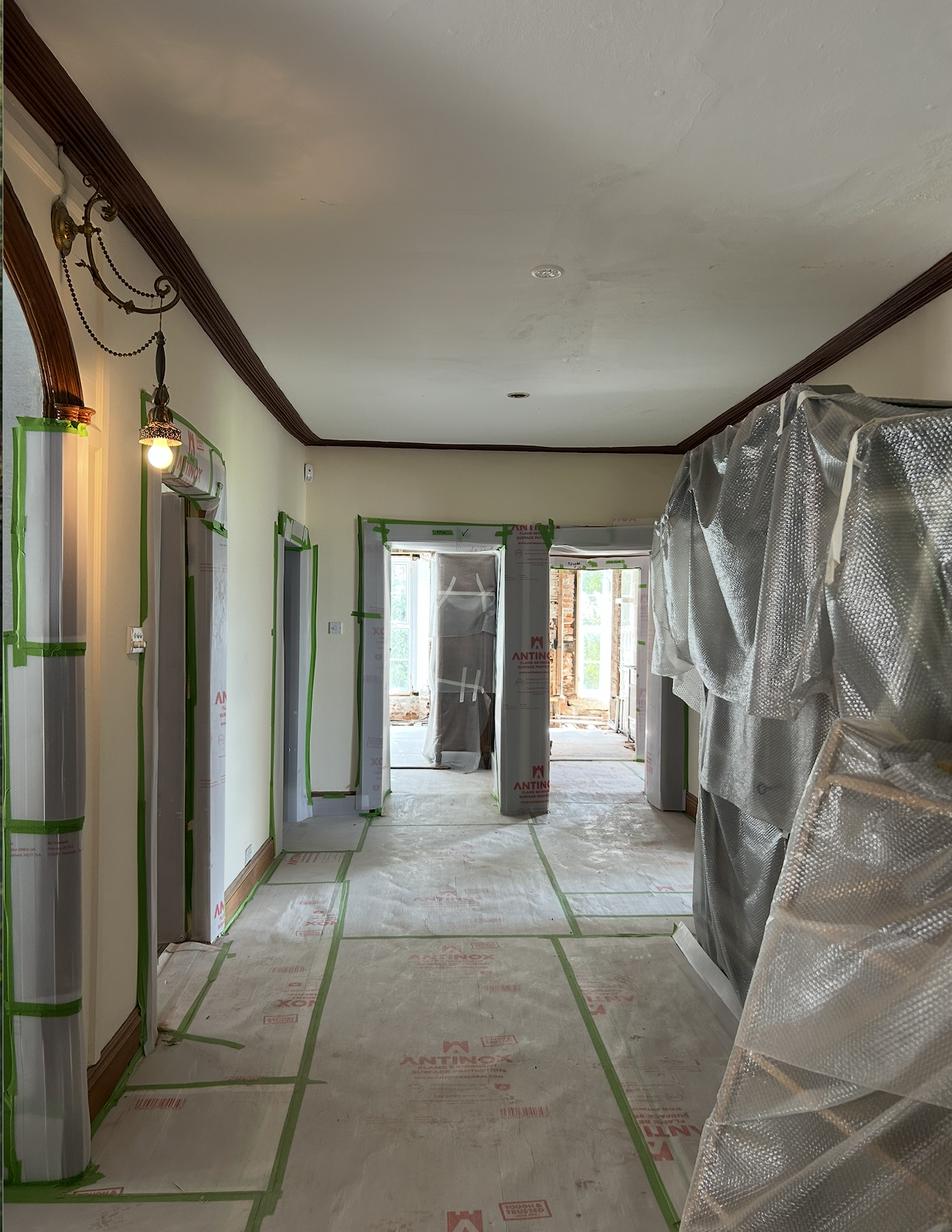 use the structure of this room remove all materials that are covering doors and architraves the floor should be a rich dark stained pine floorboard the walls should be a warm limewash retain the light fitting on the left but place a small linen shade on it the doors should be have reclaimed dark wood texture to complement the floor the ceiling cornice should be a painted light warm netural to match the wall s limewash tone