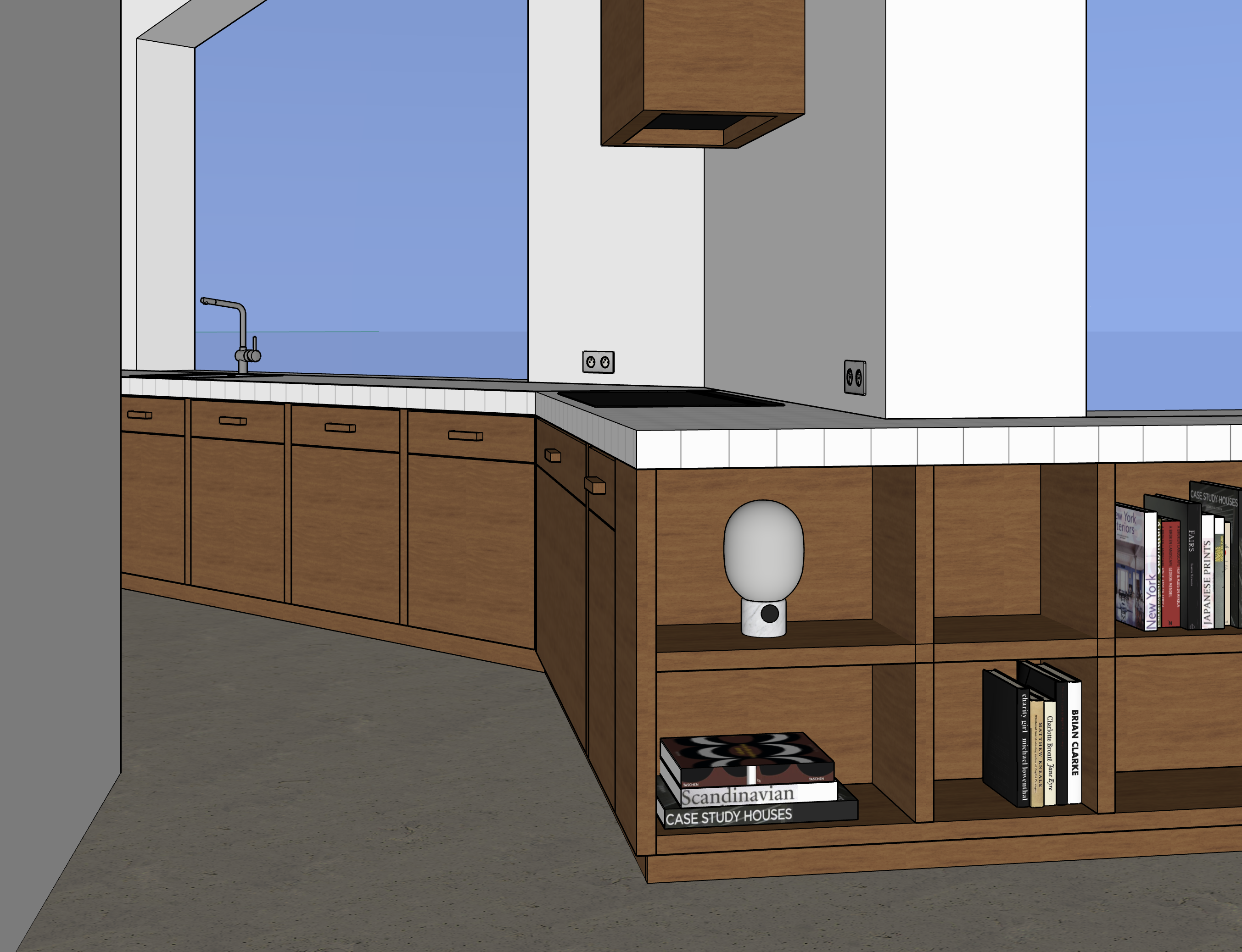 urban garden behind the windows autumnal the handles of the cabinet doors should also be made of wood and the floor should be a neutral poured concrete floor add someone who is cooking and a bit of toys on the floor in front of the bookcase