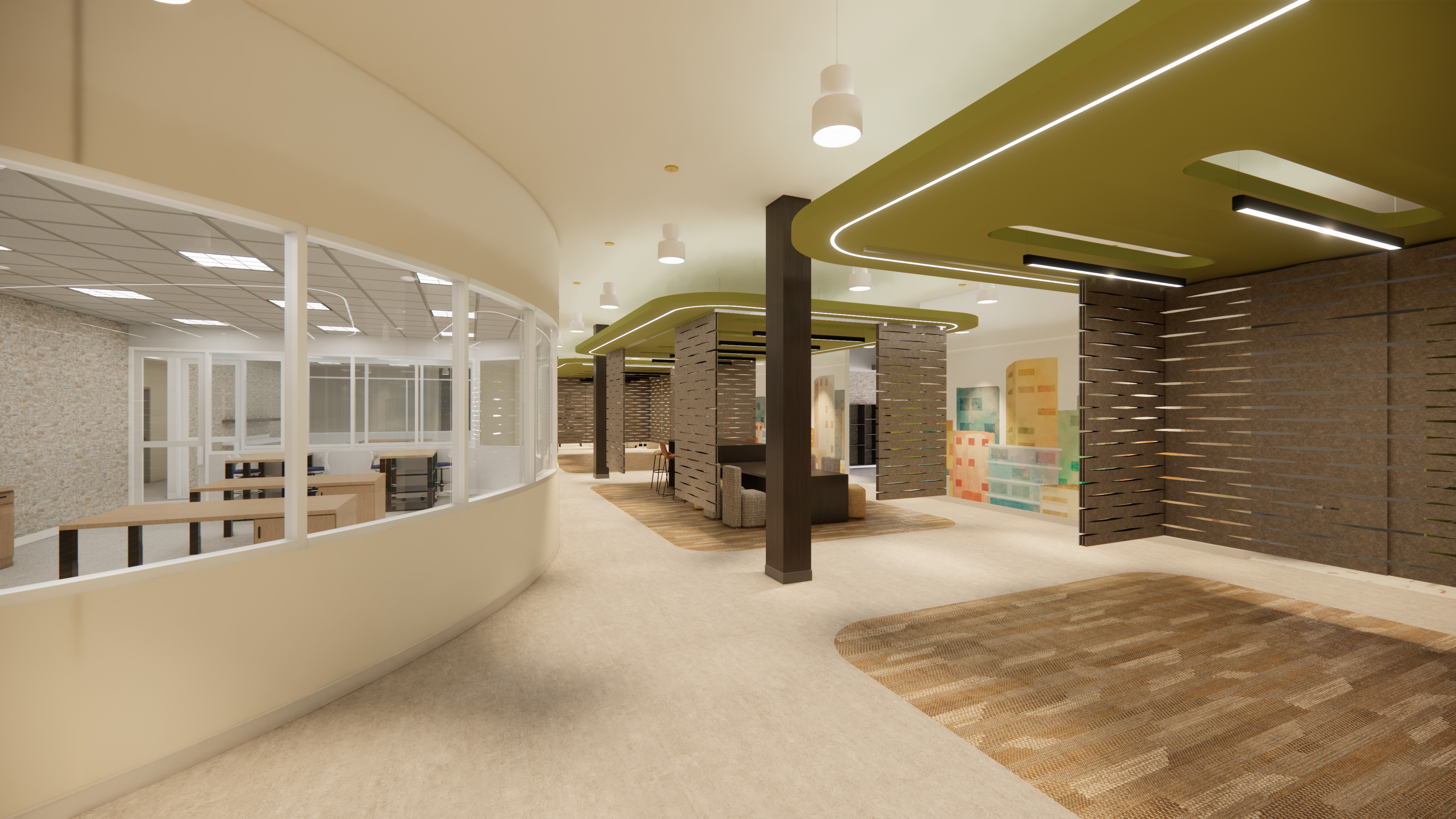 add small retail vignettes under the green ceiling clouds add people making clothing and accessories in the room with the glass wall show exposed structure above the green ceiling clouds make it painted white and vignettes the same