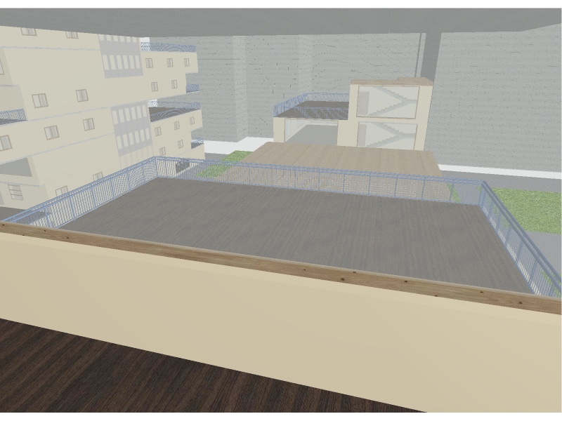 render a beautiful modern urban scene featuring a multi story building with beige exteriors use soft glass panels for railings and accents the rooftop terrace should feature rich mahogany wooden floors adding warmth and elegance surroundings include lush green patches of grass and light gray concrete pathways create a serene atmosphere with soft ambient sunlight casting gentle shadows to enhance the textures and colors capturing the essence of a peaceful afternoon in the city also the view is from the interior looking out of the glass