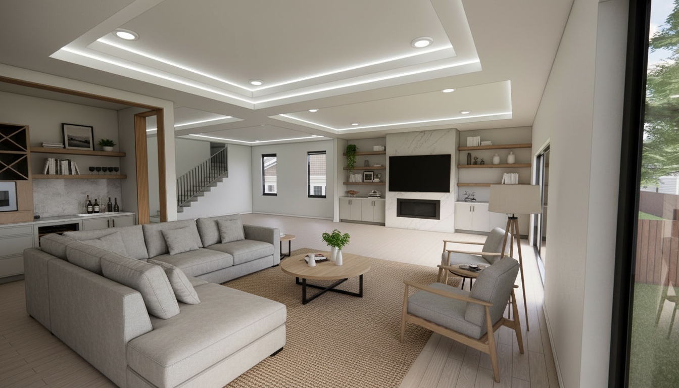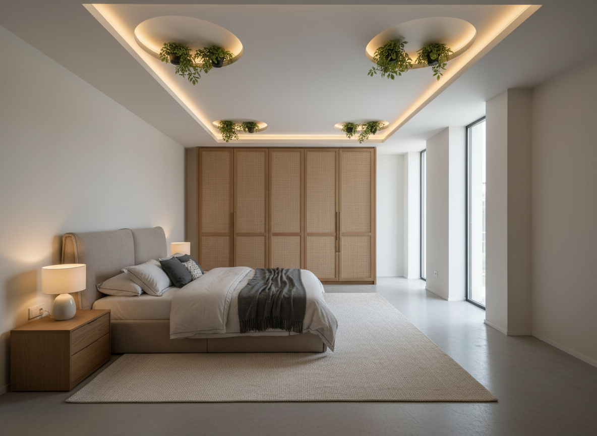 same camera view remove all pipes increase window height keep same length modern flat wardrobe with rattan on the doors hidden lights and pots on the false ceiling tone should be inviting and relaxing all walls to be smooth off white no plants