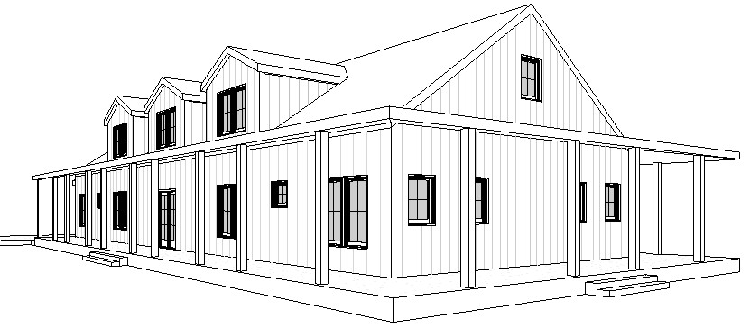 a modern farmhouse with black windows dark gray green vertical siding and fascia stained posts and garage doors country setting with large oak trees and layer california native landscaping do not modify structure