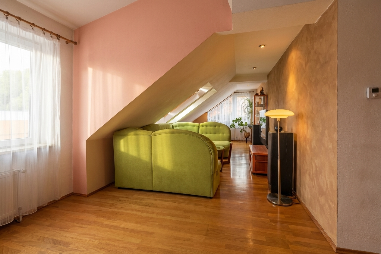 vykresli modern interi r odstra n bytek mimo sklen n vitr ny a stojac lampy v echny st ny a podhledy prove v barv b l krom st ny za sklen nou vitr nou vpravo dekora n st rku na t to st n prove m rn sv tlej a se zlatav mi odst ny ponechej z clony vykresli jako modern jednoduch hladk a spl vav beze zm n ponechej pokojov rostliny a podlahu