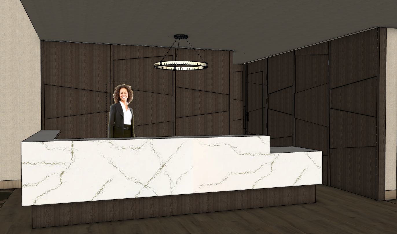 a modern minimalist reception desk design medium oak flooring complements a light wood grained reception desk an led lit back wall with lit details the atmosphere is calm and relaxing the lighting is soft and natural creating a relaxing spa like atmosphere the back wall is illuminated by led strips washing down from the ceiling and from each detailed niche all asymmetrical detail to have lighting coming down