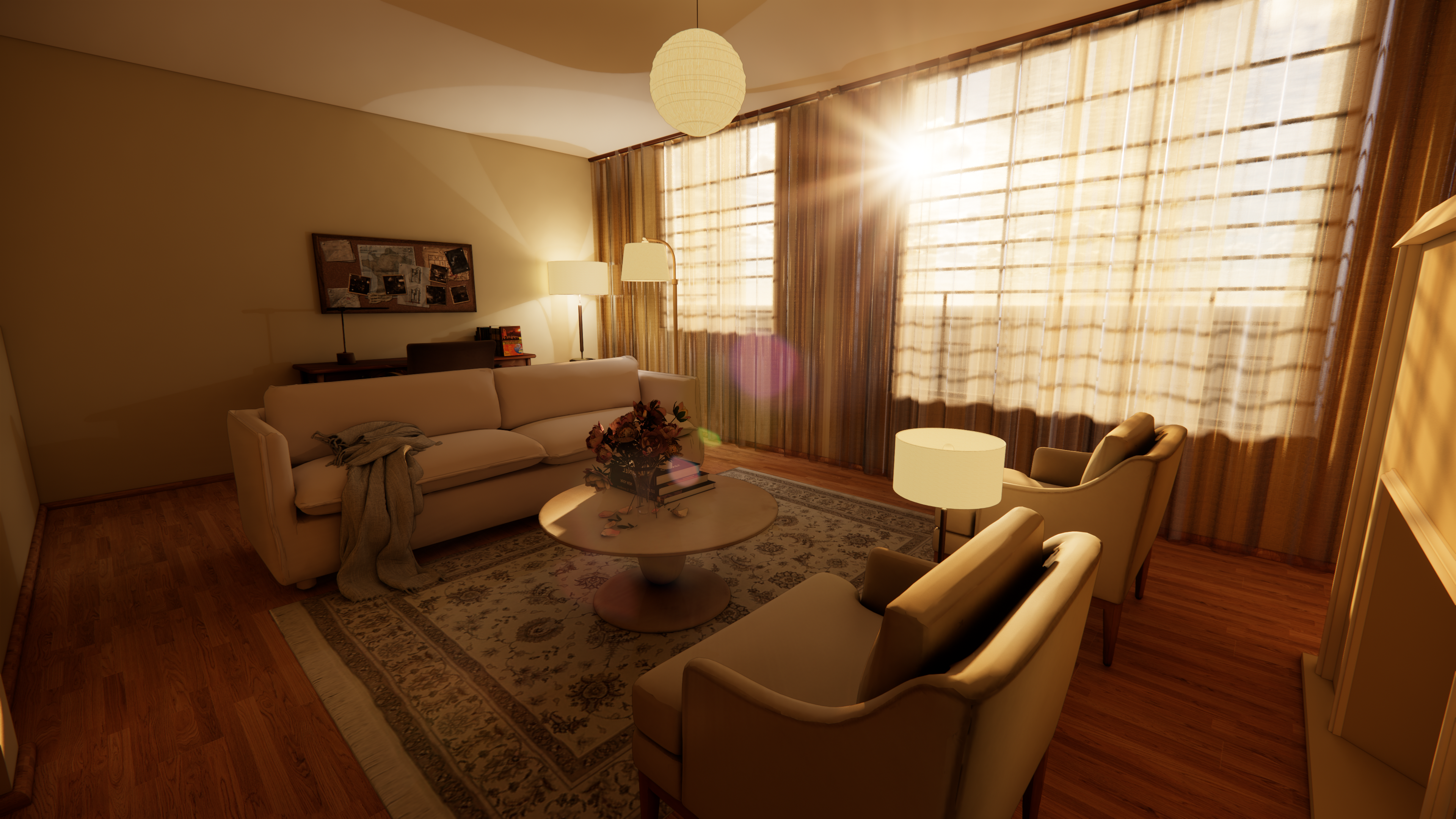 improve the quality of the materials in this render place rays of light from the sun coming through the win dow at golden hour and a blue sky in the background