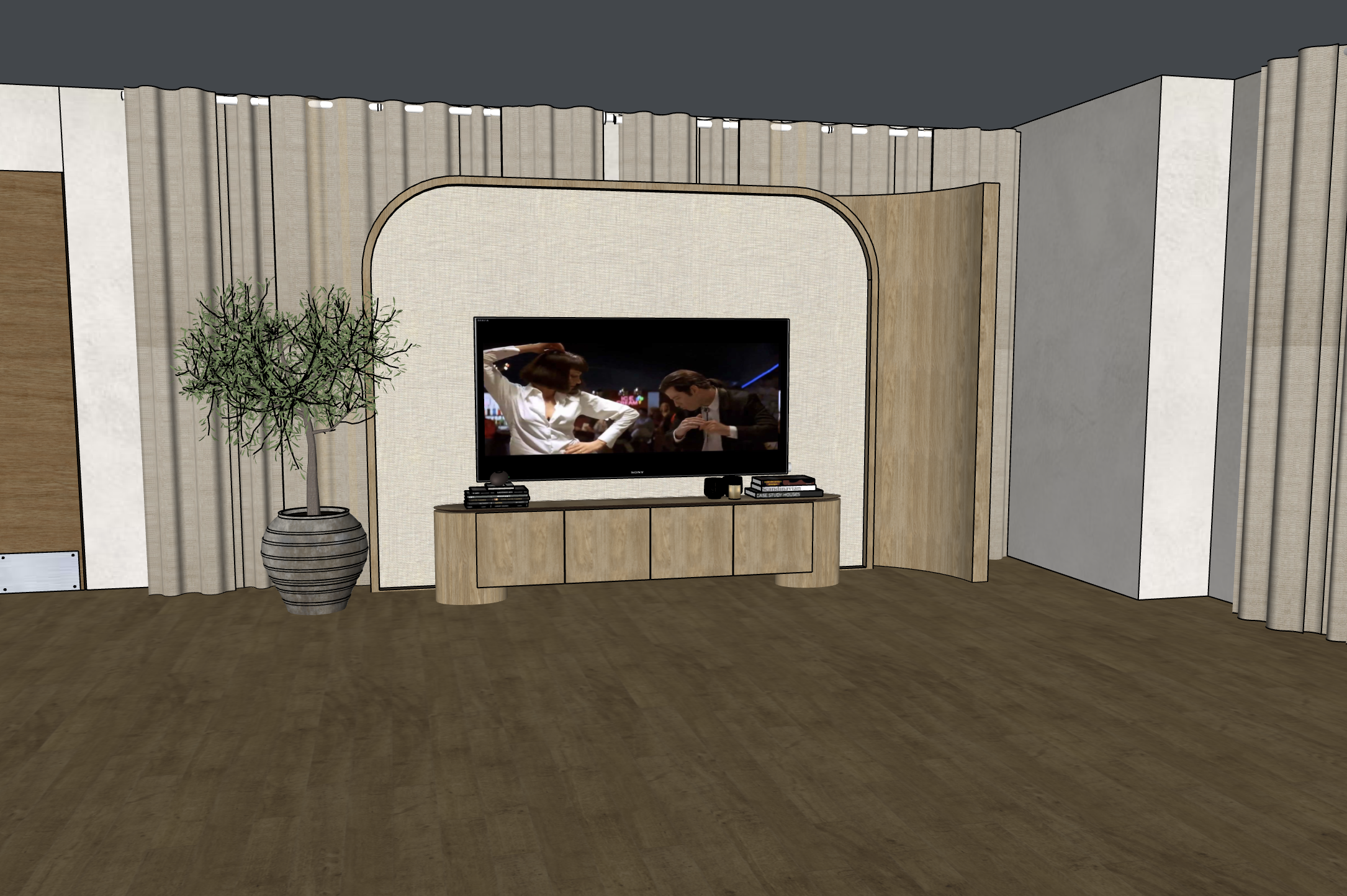 make a photo realistic render use natural light add typical office panelled ceiling with the general light on add accent lighting behind the actual tv be very precise with the render don t add any new objects add people in wheelchairs watching tv