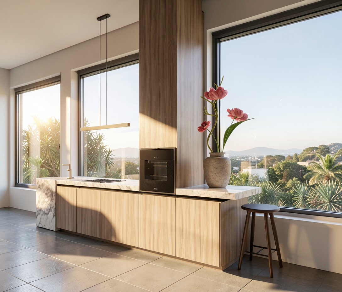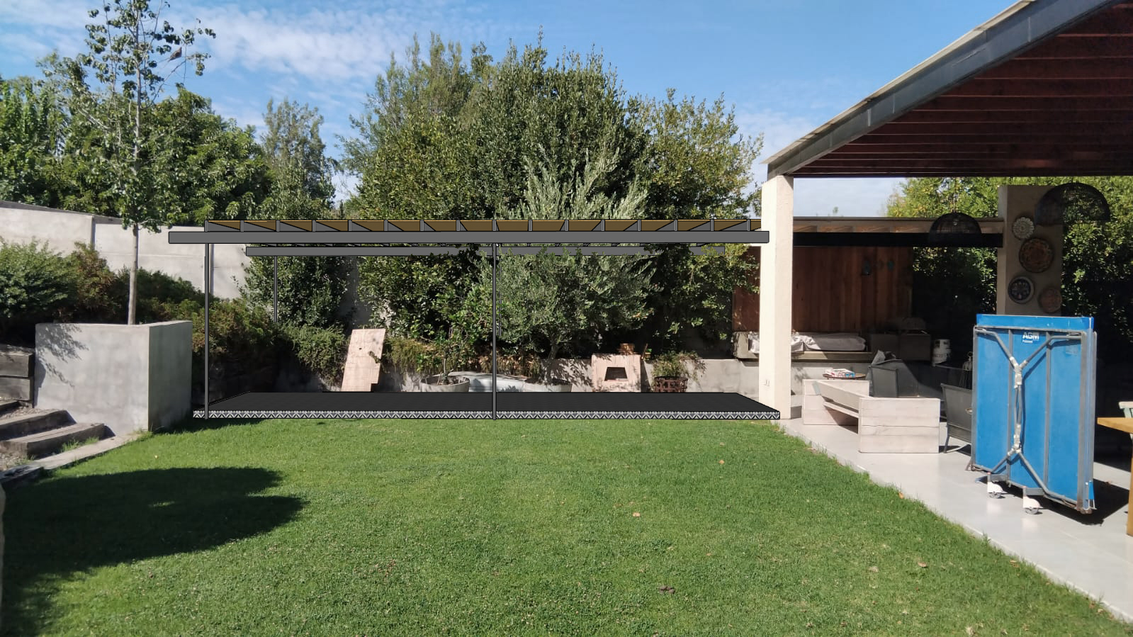 exterior image do not modify or alter the existing geometry in any way strictly maintain all architectural volumes roof lines pavement limits heights proportions and structural elements no reinterpretation of forms no resizing the pavement extension and the roof extension currently look visually disconnected visually unify both elements into one coherent architectural composition using the same existing materials and aesthetic language the intervention must feel intentional and integrated not added or patched do not change shapes only improve continuity material transitions and visual coherence roof specification must remain exactly as designed main structural frame of the new roof black metal structure perpendicular wooden slats above structure white painted wood ceiling finish coligue natural bamboo texture maintain these material identities clearly and accurately lighting adjustment create a warm natural daylight atmosphere like a pleasant sunday lunch soft sunlight gentle shadows warm but realistic tones clean architectural photography look correct vertical lines no distortion add a dining set under the drawn roof on the left side of the image correct architectural scale scandinavian style light wood dining table elegant minimal chairs subtle table setting refined not cluttered the final image must feel premium sellable scandinavian architectural photography quality cohesive and refined keep all other elements exactly as they are