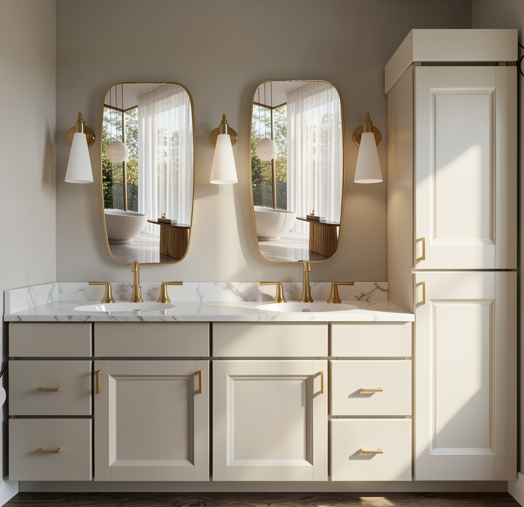 make bathroom and closet look realistic make floor tile lighter add trees behind window dont add window at the back wall