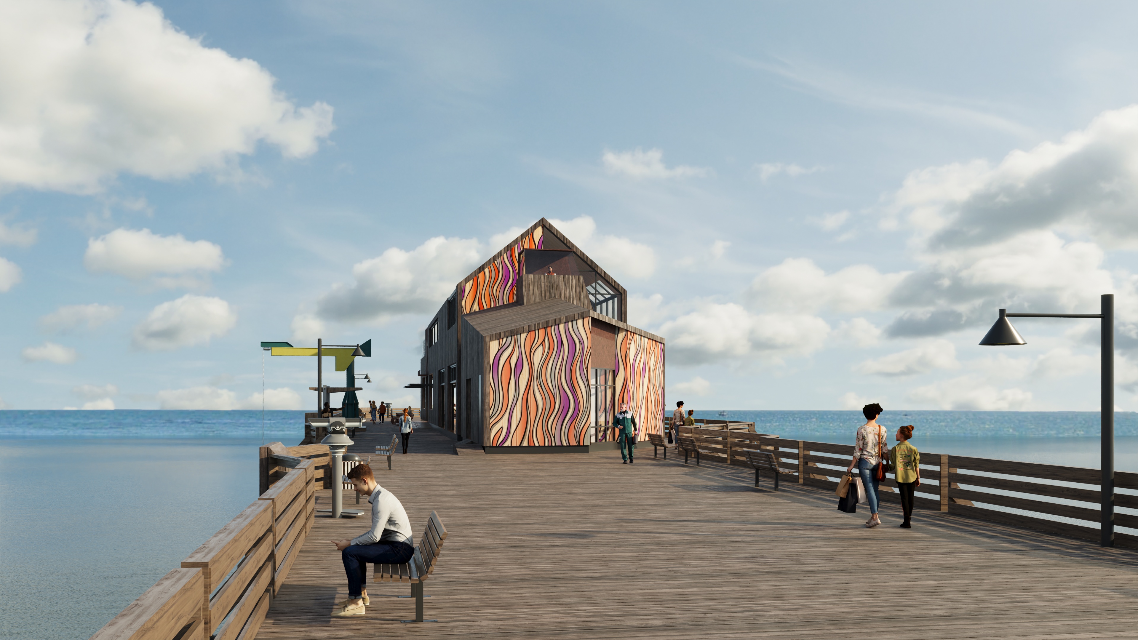 make it sunset time of day but more of a calm glowing blue ambient time with light coming from the interior of the building more people walking add a couple of fishermen lighten it up a little to articulate the form of the building make the ocean more realistic and green and make the sky more foggy blue