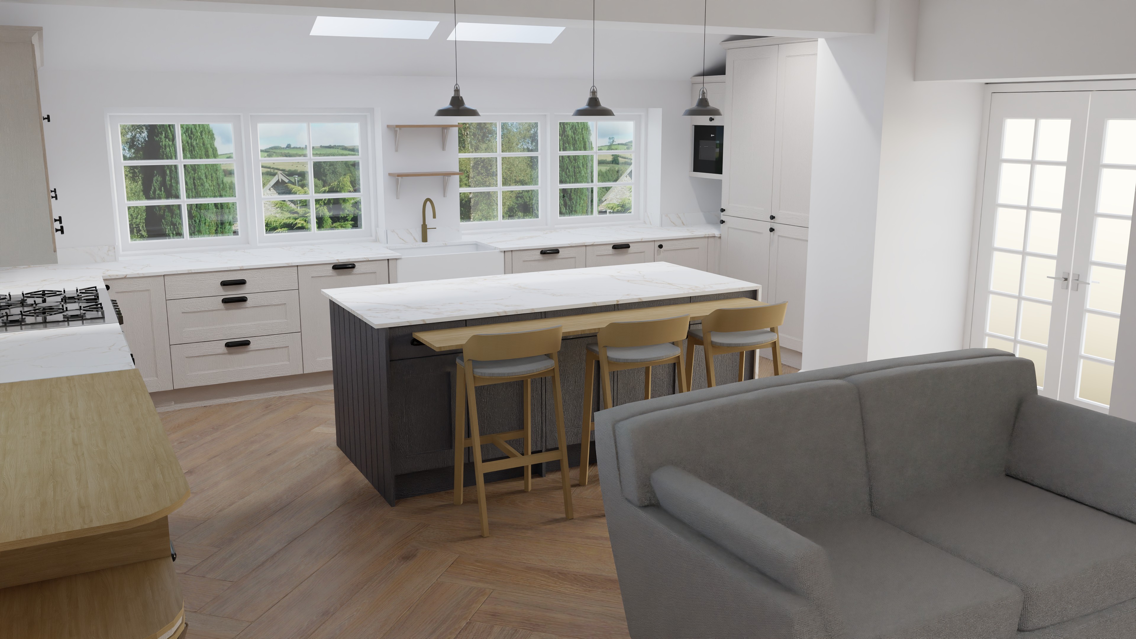 dress shelves above sink peace lily on island top books under microwave and a chopping board with vegetables on the island comfy cushions on sofa
