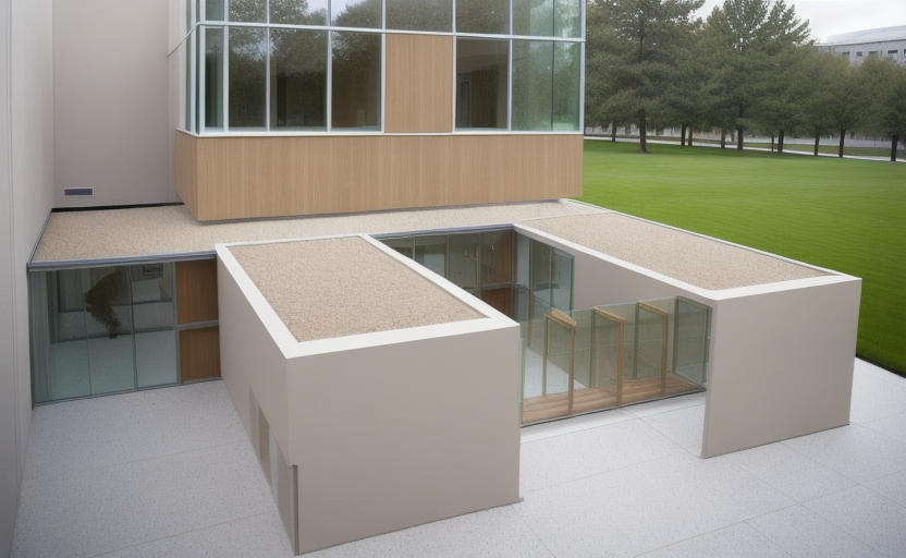 modernist exterior shot big glas window oak frames beige travertin stone facade grass on rooftop no background architecture