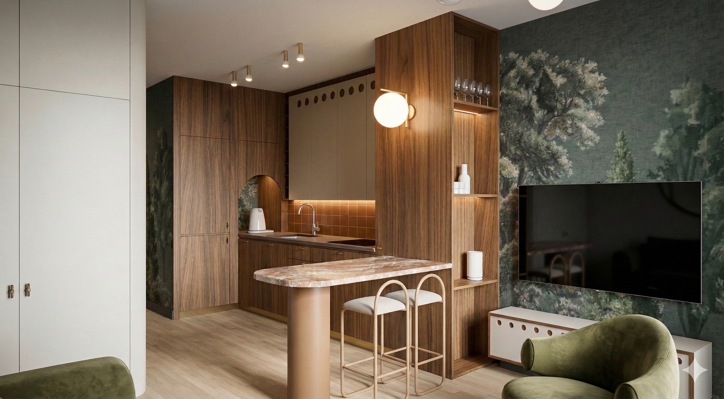 ultra photorealistic 3d render of a modern open plan kitchen and living area narrow apartment layout eye level perspective 28mm lens physically accurate materials global illumination high detail realistic imperfections kompozycja i kamera widok z poziomu oczu lekko z prawej strony salonu skupiony na zabudowie kuchennej w fornirze orzechowym p wyspie z kamiennym blatem cianie rtv z ciemn tapet pejza ow telewizorze i niskiej szafce fragment fotela w kolorze oliwkowym w prawym dolnym rogu subtelna g bia ostro ci ostro na p wyspie i zabudowie materia y i tekstury klucz do realizmu zabudowa kuchenna fornir orzech naturalny natural walnut veneer wyra ne pionowe us ojenie delikatna r nica odcieni mi dzy frontami random tone variation 2 3 satynowe wyko czenie roughness 0 4 0 55 lekka nieregularno subtelny bump normal map 0 3 mm minimalne mikroszczeliny mi dzy frontami 2 mm delikatne zaokr glenie kraw dzi bevel 1 2 mm drewno nie mo e by jednolite musi mie naturaln g bi i mikroodbicia blat p wyspu natural stone slab breccia marble look ciep y be owo r owy odcie nieregularne u ylenie polerowane wyko czenie glossy but not mirror roughness 0 15 0 25 subtle micro scratches real edge thickness 3 4 cm minimalny bevel pas mi dzyblatowy ma e geometryczne p ytki ceramiczne odcie terakota karmel p matowe szkliwo lekko nier wna powierzchnia handcrafted look subtelna r nica odcieni mi dzy p ytkami widoczna fuga ciep y be g rne fronty jasne matowy lakier w kolorze ciep ego be u taupe super mat roughness 0 65 0 75 minimalny soft reflection idealnie g adkie ale z delikatnym micro roughness noise ciana rtv tapeta pejza owa dark moody mural wallpaper g boka ziele grafit przygaszone tony motyw drzew w stylu malarskim matowe wyko czenie bardzo subtelna tekstura w kna fabric bump 0 1 delikatna gra wiat a przy kraw dziach telewizor ultra thin flat screen czarna tafla szk a subtelne odbicie wn trza lekki kurz mikro smugi bardzo delikatne cie kontaktowy przy cianie hokery chromowana stalowa konstrukcja real metal reflection lekko szczotkowany metal siedzisko tapicerowane jasn tkanin subtelne zagniecenia kontaktowy cie pod nogami fotel fragment oliwkowa tkanina velvet mi kka plecionka subtle sheen delikatne fa dy zr nicowanie kierunku w kien pod oga natural oak wood flooring jasny d b matowe wyko czenie delikatne szczotkowanie r nice tonacji mi dzy deskami micro bump 0 2 mm realistic plank joints o wietlenie bardzo wa ne wiat o dzienne hdri natural daylight lekko ch odne 5200k mi kkie cienie wyra ny bounce light od pod ogi wiat o sztuczne led pod p kami 2700k spoty sufitowe 3000k kinkiet kula ciep e wiat o lekko przepalony rodek subtelny bloom r nica temperatur barwowych zwi ksza realizm postprodukcja fizyka kamery lekka winieta iso grain 2 bardzo subtelna dystorsja obiektywu real exposure balance brak przepale filmic tone mapping high dynamic range natural color grading dodatkowe parametry techniczne ultra realistic 8k resolution global illumination ray tracing physically accurate materials soft contact shadows no cgi look no flat textures realistic imperfections architectural photography style
