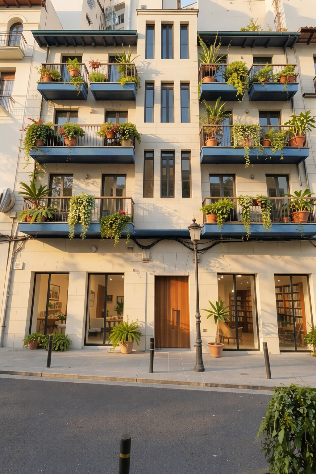put the centre of the facade in the same desaturated blue grey color from the first floor to the last floor keep the ground floor i the same as now