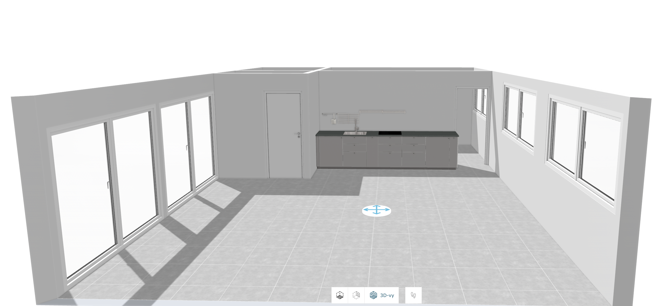 black windows and doors everywhere slide black door between gray tiles 60x120cm white walls the kitchen remains the same opposite the kitchen a training machine gladiator in the middle of the room a billiard table towards the balcony exit a sofa and an office desk