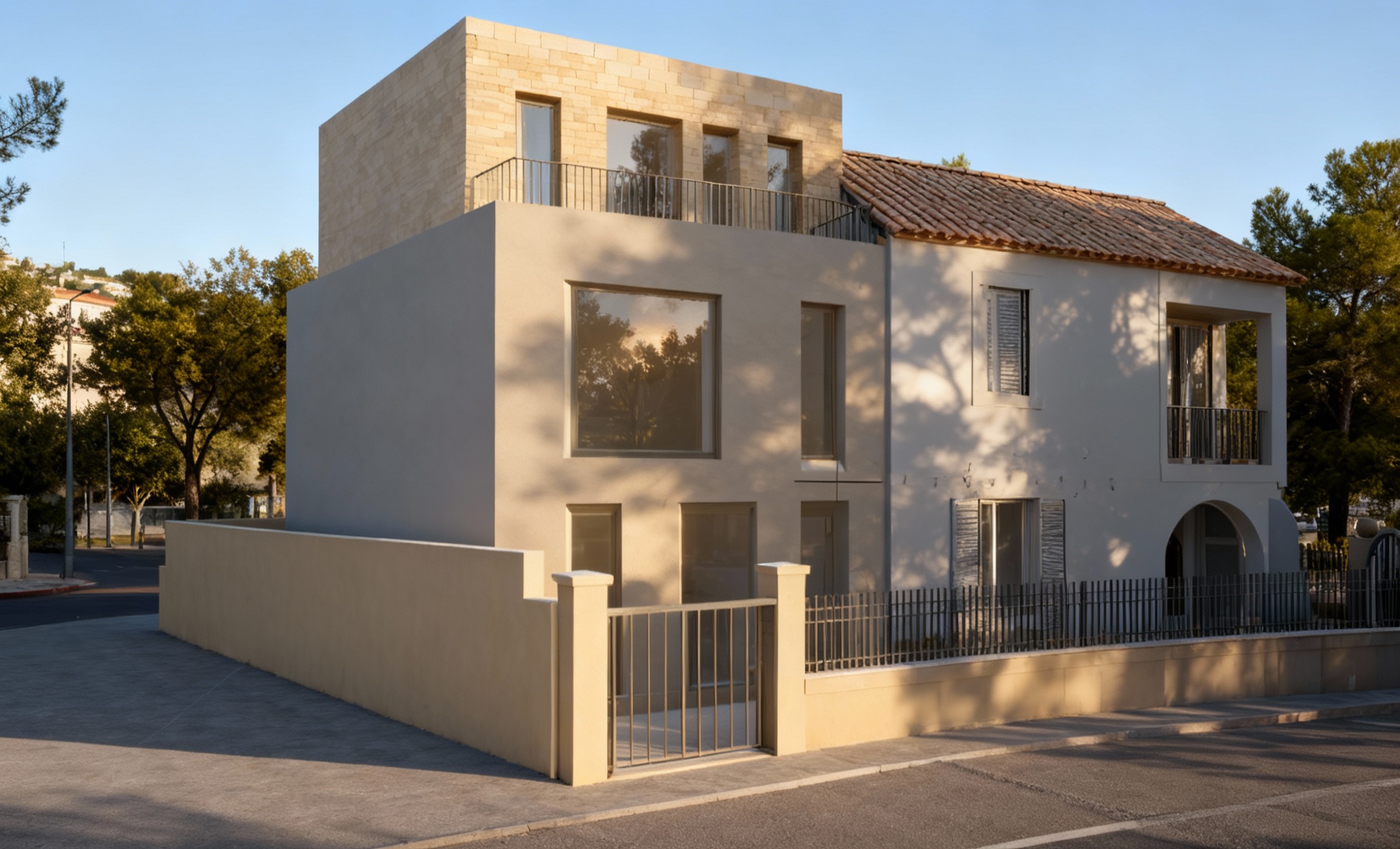 modern two story house cream and sandstone facade roof with deep maroon tiles large windows with black frames adjacent single story extension with matching roof red brick driveway lush green hedges surrounding the property bright and sunny atmosphere clear blue sky with soft diffused lighting realistic rendering fine architectural details highlighted