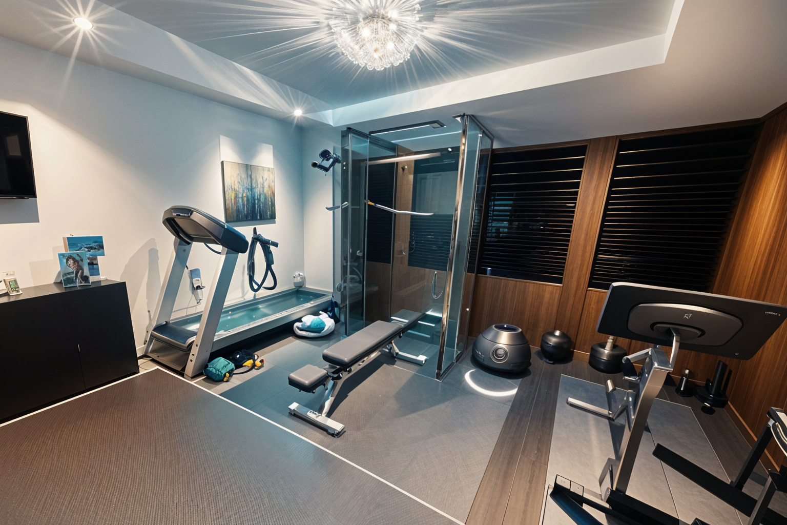 modernist interior shot luxury basement gym in a west vancouver home recessed ceiling lights treadmill rowing machine yoga mats light wood accents spa like modern aesthetic glass wall divider with view of wine cellar architecture