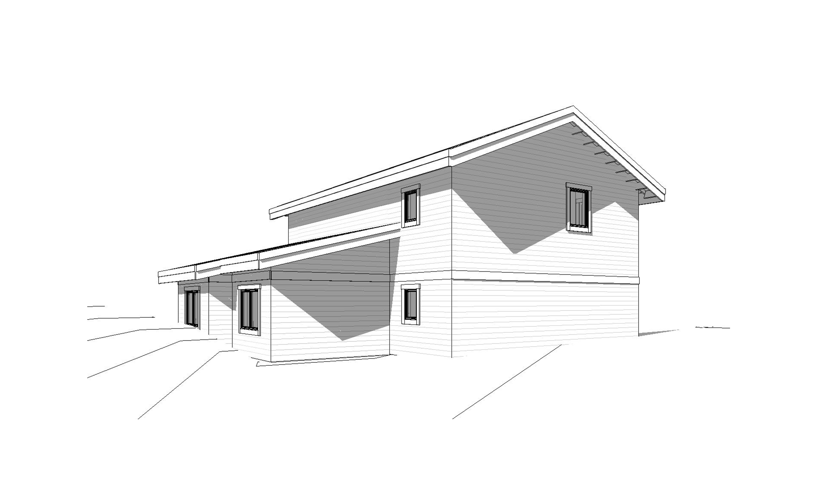 front view of a clean architectural exterior home rendered in mid day lighting with blue skies and sun streaks hitting the structure home in a summer mountain setting with faint streaks of light coming through trees in the surrounding area warm glow and mountain reflections off of the windows select grade douglas fir horizontal siding green manicured landscape around structure with gardens and patches of grass black standing seam metal roof prominent trees in the background high fidelity photorealistic visualization crisp shadow falloff refined facade geometry soft atmospheric depth premium architectural photography mood ultra clean composition and materials black window trim flat roof home on the base of a hill with the hill close to the house in the foreground photorealistic render