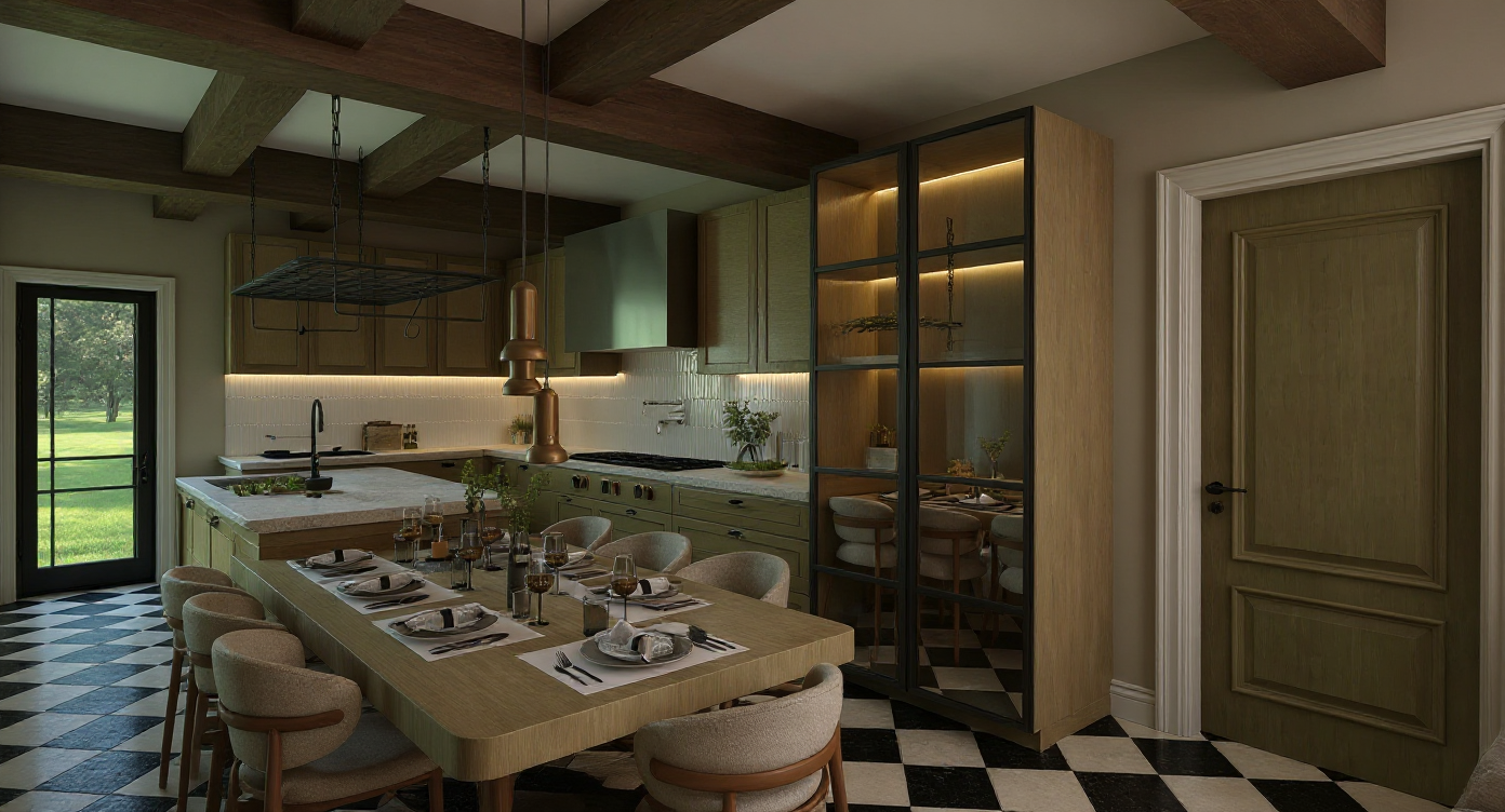 modern lounge and entertainment space interior render neutral elegant palette with greige limewash walls light wood flooring and a central large light gray sofa facing a wall mounted tv sleek black open bar structure with glass shelving with warm backlighting smoked mirror backwall the two black pieces on the bar area should be black tinted wood bar stools and a round dining table with upholstered light beige leather chairs soft ceiling lighting refined contemporary atmosphere realistic materials subtle reflections and a clean photorealistic architectural visualization style