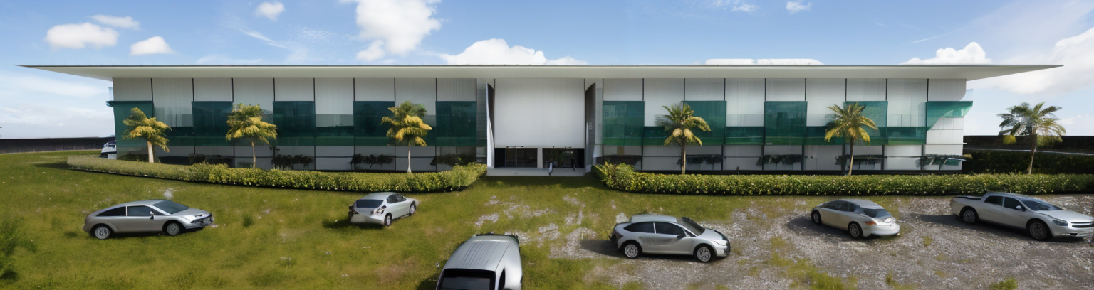 modern tropical commercial building with a wide butterfly roof made of clean metal panels not covered in vegetation the front fa ade is composed of full height clear glass panels with horizontal framing a grand recessed entrance is framed on both sides by tall vertical wooden louver walls on the building s face green walls are visible only between the windows not on the roof in the foreground is a large textured brick paver parking lot made of interlocking red and gray concrete bricks the pavers are clearly visible beneath several parked cars people are walking across the parking lot and entering the building palm trees trimmed hedges and lush tropical landscaping surround the site the setting is a bright sunny day with a clear blue sky and crisp shadows architecture
