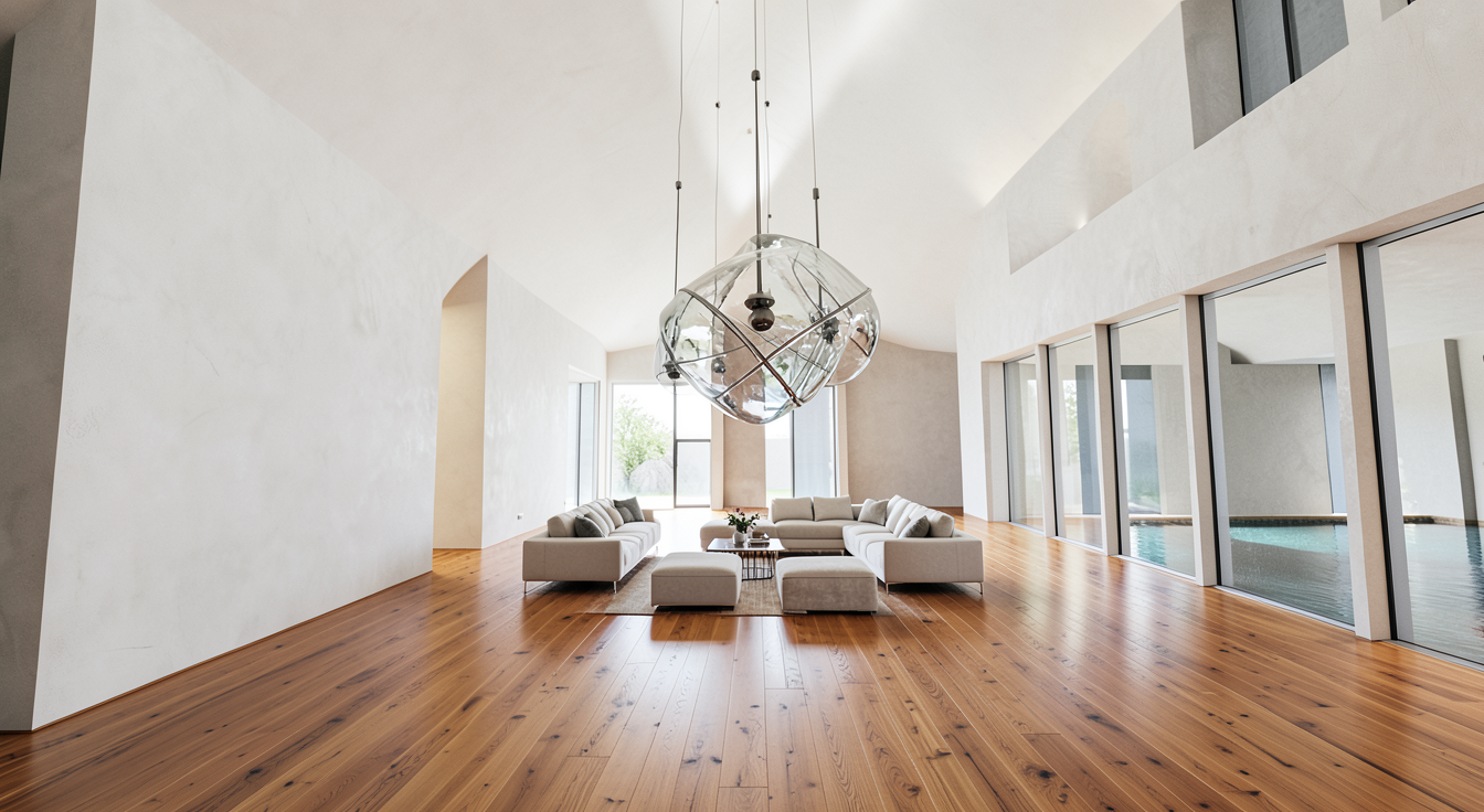 museum scale residential living room oversized architectural volume towering white ceiling and tall vertical walls expansive open plan warm oak floors restrained mineral palette one large sculptural lighting element suspended high above lagoon inspired textures through glass and polished stone seating grouped tightly to leave surrounding emptiness minimal curated decor quiet luxury atmosphere architectural photography wide angle lens 16 18mm emphasize height depth and distance between elements
