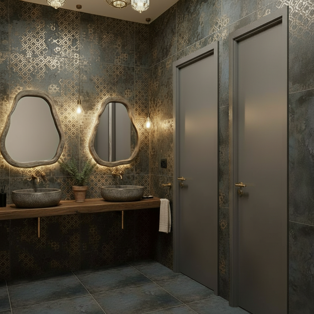 redesign the restroom to match the reference images and create a high end mediterranean luxury look add a layer of small pebbles alo with linear lighting under the wooden countertop where the washbasins are placed the light should softly highlight the pebbles use the combination of wall finishes i provided and add a darker stone cladding behind the mirrors for contrast replace the current mirrors with long oval ones with black frames and subtle led backlighting update the ceiling lights with elegant mediterranean style chandeliers or lamps based on the reference images include all the decorative details from the images i sent make them stylish balanced and natural the atmosphere should be warm luxurious and sophisticated with perfect lighting balance and realistic materials the final result must have a real wow effect visually stunning and photorealistic exactly what an investor would expect from a premium mediterranean restroom