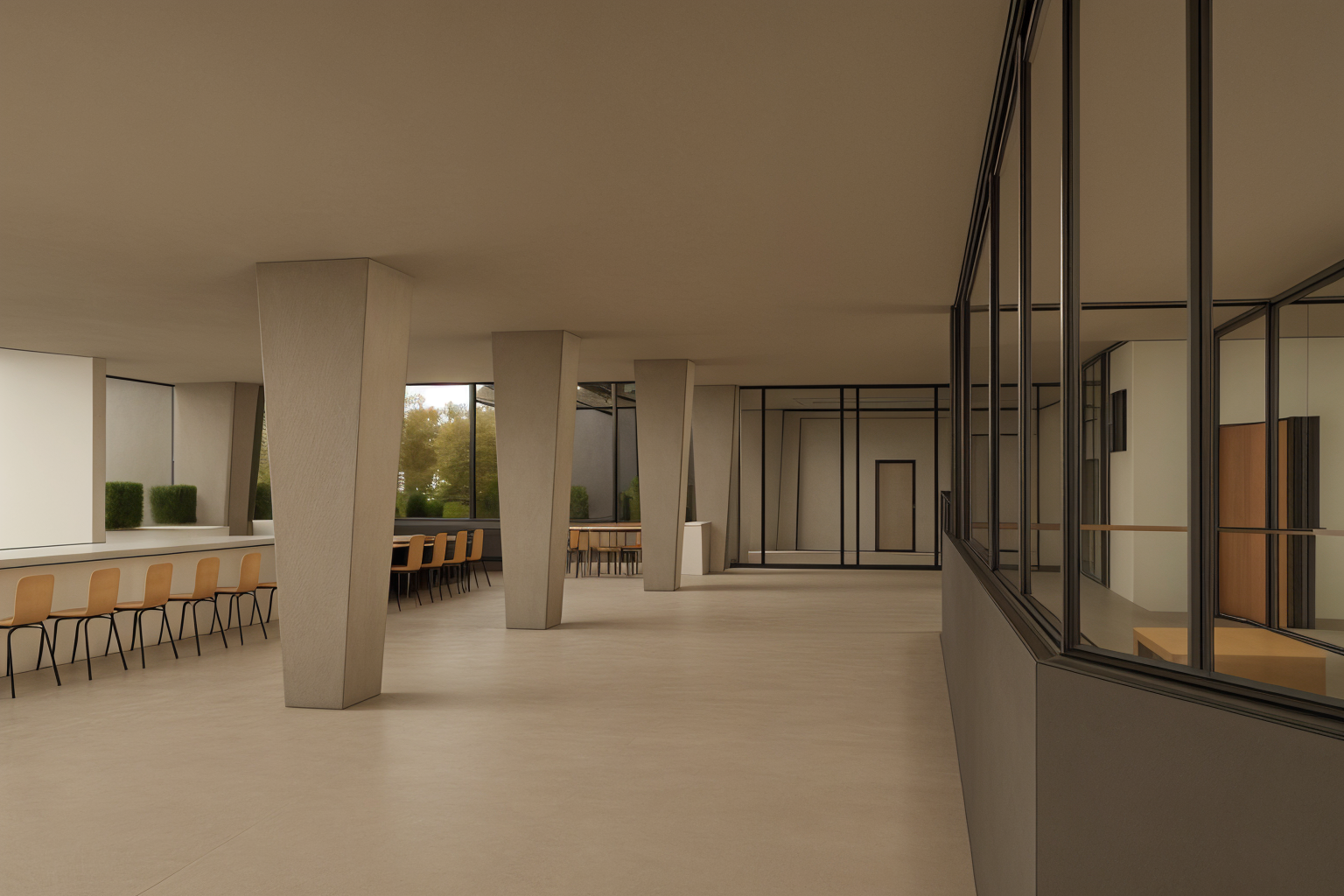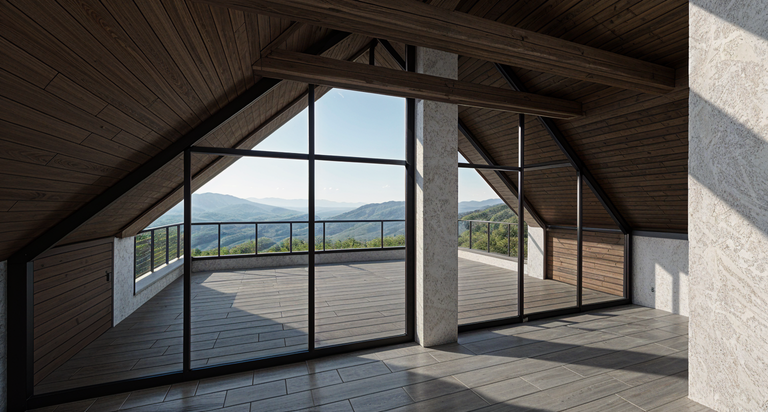 modernist interior shot stylish modern living room with a serene atmosphere featuring a large l shaped brown sofa positioned on sleek gray tiled flooring the walls are a soft white with large windows and doors framed in dark gray allowing natural light to fill the space the feature wall showcases a large flat screen tv with a stunning landscape and is accented with a deep charcoal finish below the tv a sophisticated unit in white and dark wood tones houses black and wood colored speakers and decor a glass top dining table is surrounded by high back beige upholstered chairs with dark wooden legs include lush green potted plants for a touch of nature the overall color palette conveys a harmonious and elegant ambiance architecture