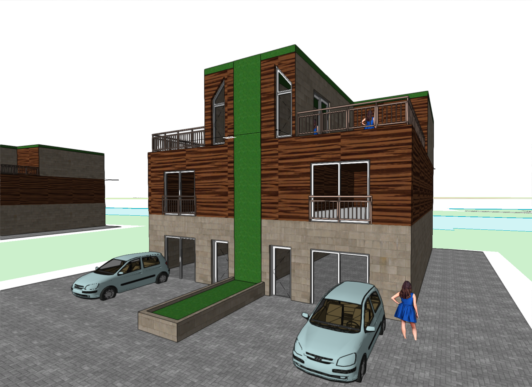 render this in stone and timber cladding finish with a green plants wall in the middle add woods in the background