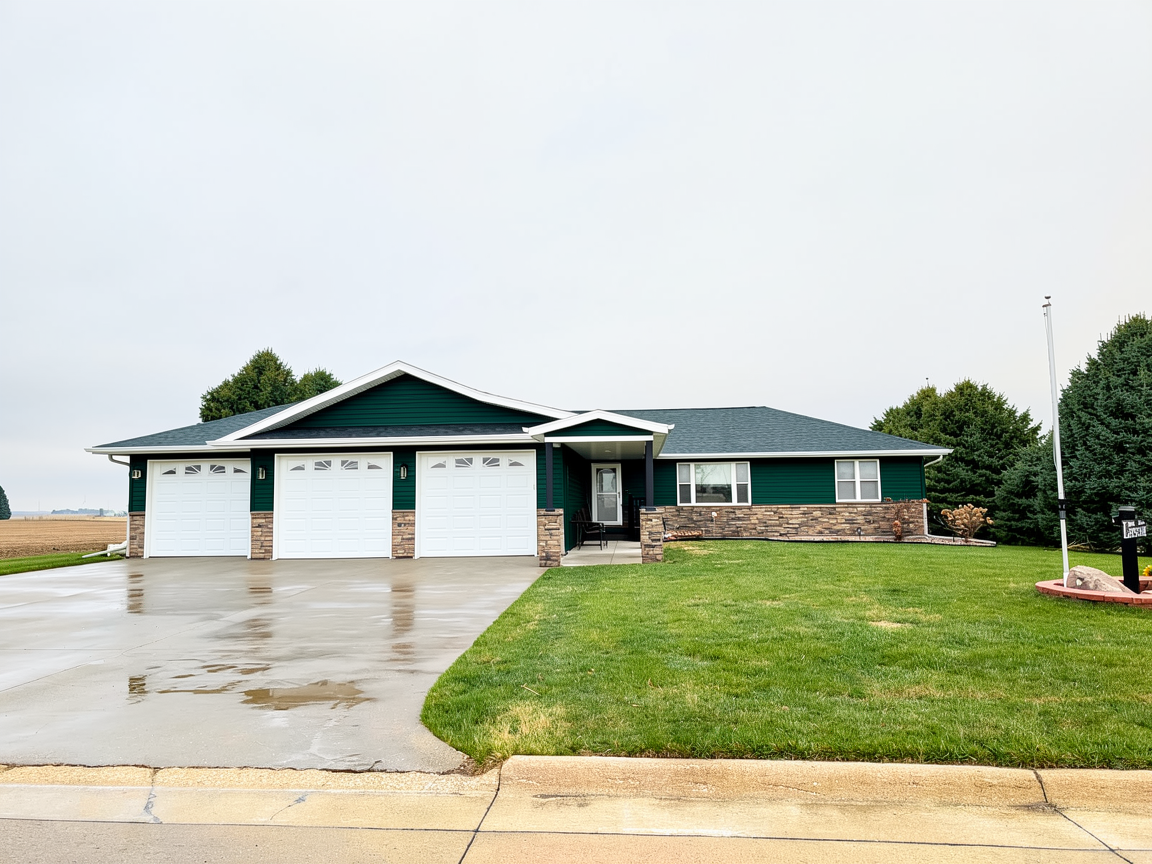 change siding color to diamond kote emerald and keep garage doors and windows white and keep posts black