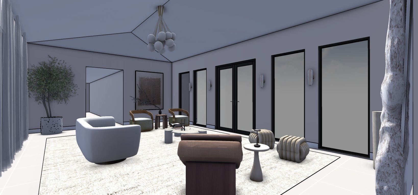 create a highly photorealistic interior render from this 3d scene all walls should be a very light soft gray clean and minimal matte finish the ceiling should be pure flat white completely matte and uniform turn on the wall sconces mounted on the column and along the wall with a warm dimmable light around 3000k soft and subtle creating gentle wall glow and realistic light falloff turn on the ceiling chandelier light as well emitting a warm diffused glow that softly illuminates the seating area maintain the exact furniture layout and composition make one of the two square modular ottomans darker using a polished black marble material with subtle natural veining while keeping the other one unchanged use realistic global illumination soft shadows accurate reflections and natural material textures high end architectural photography style ultra photorealistic cinematic interior lighting